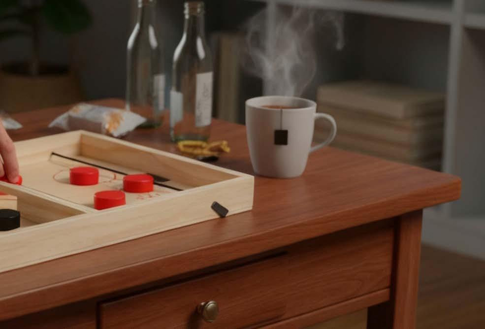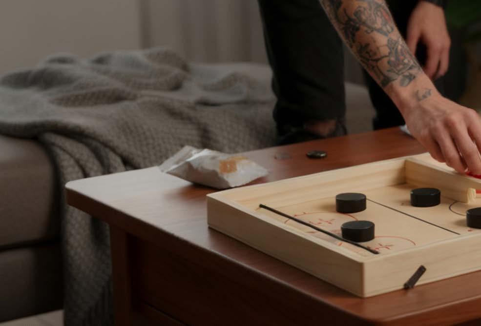 InSideOut Bordhockey byr på rask og interaktiv moro for både store og små! Skyt puckene med strikk til den andre siden for å vinne. Denne bordmodellen i tre av høy kvalitet stimulerer hånd-øye-koordinasjonen og passer perfekt til bruk hjemmet, på ferien eller på festen. Styrker båndet mellom foreldre og barn og gir timevis med moro.