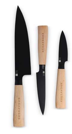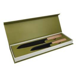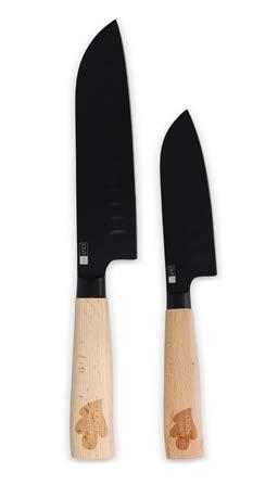 InSideOut Santoku Ravn-knivsett kombinerer stil med funksjonalitet. De høye bladene er perfekte for å skjære tynne skiver eller finhakke grønnsaker og frukt og gir utmerket kontroll, mens rillene reduserer friksjonen for jevn skjæring. Settet har et slående svart blad og FSC-sertifiserte håndtak i bøketre. Inneholder to kniver (30 cm og 24 cm) i en gaveeske.