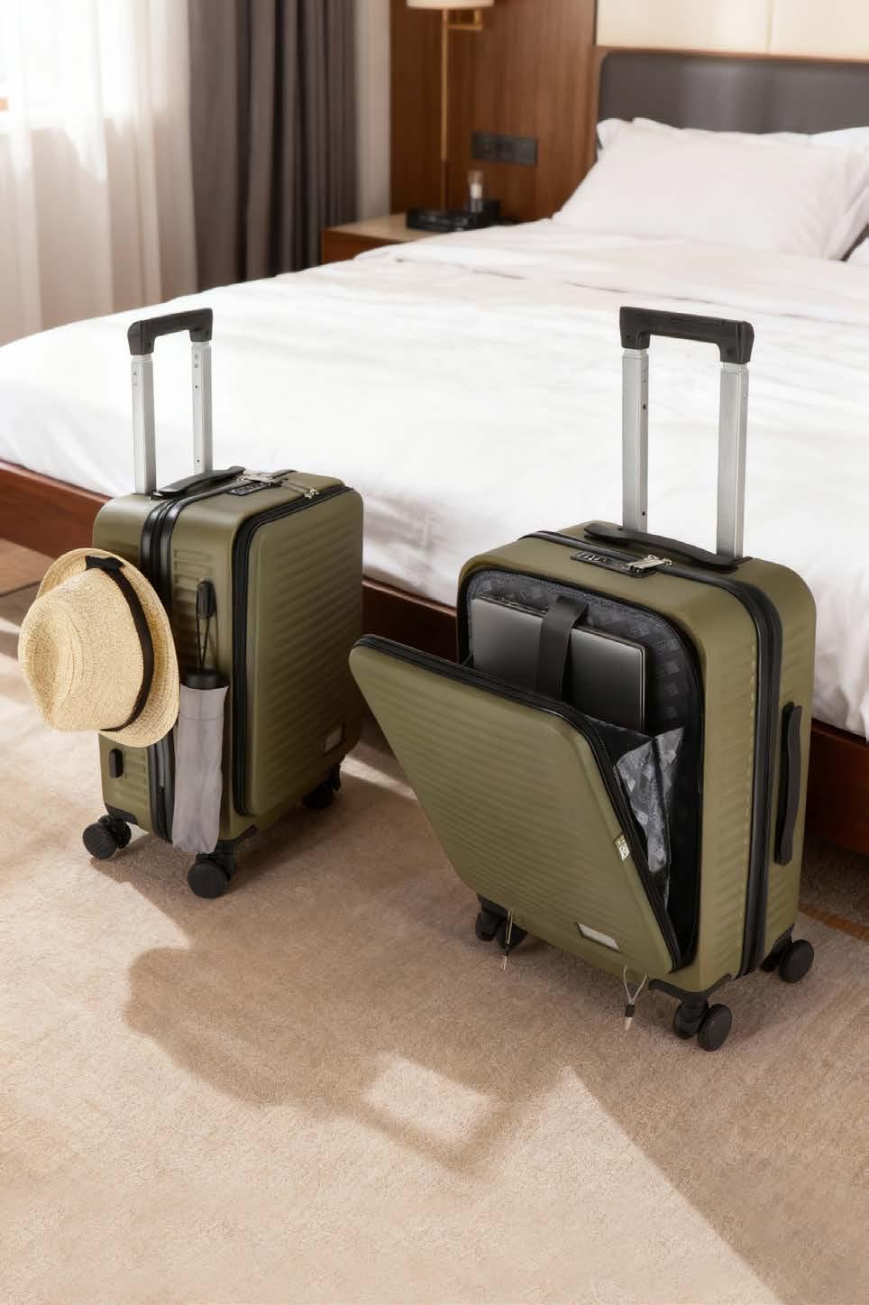 Rulla koffert fra InSideOut gjør reisen komfortabel. Den har fire svingbare hjul, en TSA-kombinasjonslås, en telefonholder i håndtaket, en integrert koppholder på baksiden, og to kroker på siden for å henge opp ting som en veske eller nakkepute. Inne i det fremre rommet er det en polstret laptop-lomme for bærbare datamaskiner på opptil 15,6 tommer.