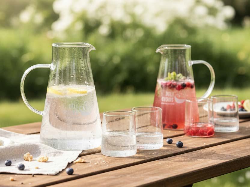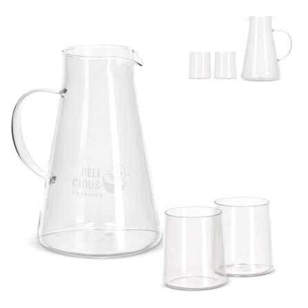 InSideOut Elin-karaffelsettet består av 2 glass og en 1,2 liters karaffel med håndtak, laget av sterkt og varmebestandig borosilikatglass. Det enkle, stilrene designet passer perfekt sammen med annet servise. Glassene har en kapasitet på 270 ml, tåler mikrobølgeovn, og både karaffelen og glassene kan graveres.
