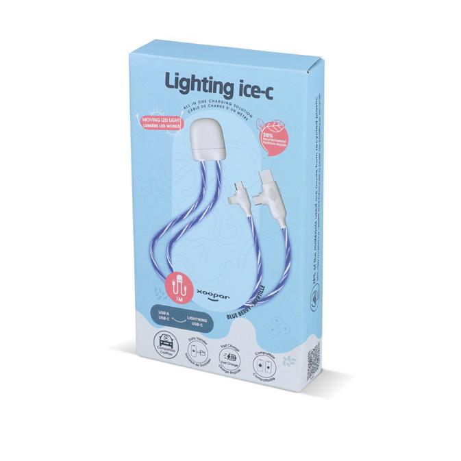 Unser neuestes 27-Watt-ICE-C-Ladekabel ist ein Multikabel mit dualem USB- und USB-C-Eingang und dualem USB-Cund Lightning-Ausgang. Es ist 2x50cm lang, unterstützt Datenübertragung und Car Play. 55% des Gewichts des Artikels bestehen aus recycelten Inhalten. Verpackt in einer FSCzertifizierten Verpackung. Größe: 11 x 590 x 35 mm