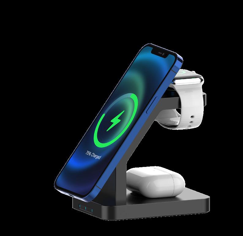 This 3-in-1 wireless charger lets you charge multiple devices at the same time. The magnetic charging surface keeps your MagSafe enabled iPhone in place. In addition, the charging pad can charge any Qi enable device. Size: 110 x 110 x 80 mm