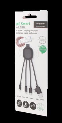 Mr. Bio Smart Charging is a multi-charging cable, with a dual USB & USB-C input connector, 3 different connectors to charge your devices and a integrated NFC chip. Mr. Bio Smart is made of recycled materials. Total recycled content is 61%. Packed in a sustainable FSC-certified packaging. Size: 32 x 150 x 12 mm
