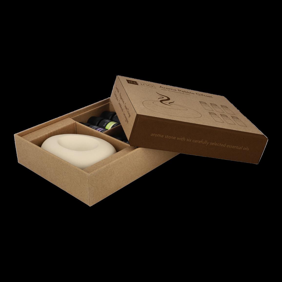 LT57304 | Set da regalo InsideOut Aroma Pebble con 6 oli essenziali Create un’atmosfera rilassante con il set da regalo Aroma Pebble con 6 oli essenziali. La pietra di ceramica non smaltata assorbe l’olio senza calore o elettricità. Include 6 oli naturali (10 ml per flacone) per la profumazione desiderata. Posizionate la pietra a casa o in ufficio e godetevi l’aromaterapia rilassante. Splendidamente confezionato, ideale come regalo.