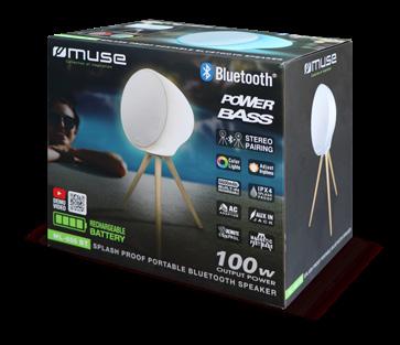 LT55025 | ML-625|Muse Ambient Light Bluetooth-kaiutin sisällä/ulkona Muse Ambient Light -kaiutin tuottaa voimakkaan 60 W äänenvoimakkuuden ja on roiskevesitiivis (IPX4), joten se sopii erinomaisesti sekä sisä- että ulkokäyttöön. Monivärinen Ambient Light -valo luo tunnelmaa mukautettavien LED-valojen avulla. Suoratoisto langattomasti Bluetoothin kautta, 10 tunnin soittoaika, handsfree-puhelut, 5 luontoääntä ja USB-C-laitteen lataus. Koko: 387 x 210 x 210 mm