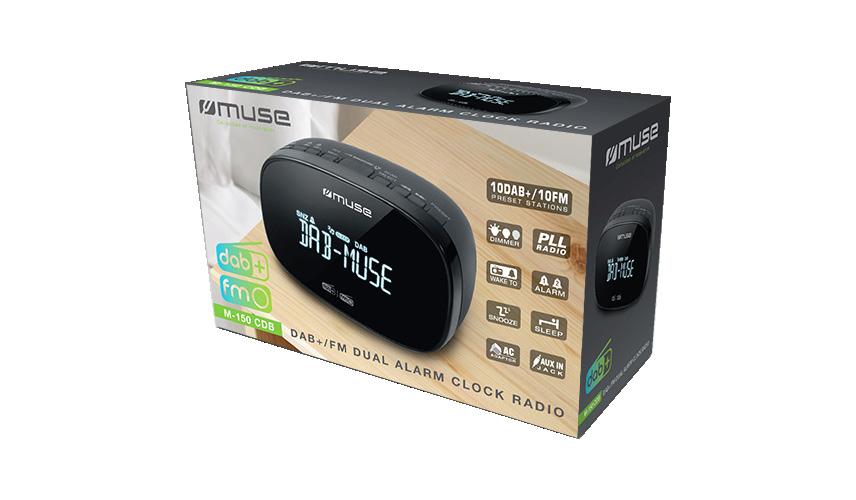 LT55000 | M-150 CDB | Muse Clock Radio DAB+ Tämä DAB+-hälytyskelloradio herättää sinut iloisesti joka aamu. Kelloradiossa on peräti 20 esiasetettua asemaa. AUXliitännän ansiosta voit helposti liittää ulkoisen laitteen tähän kelloradioon. Tämä Muse M-150 CDB -herätyskello toimii verkkovirralla ja siinä on varajärjestelmä (akku).Koko: 118 x 75 x 67 mm