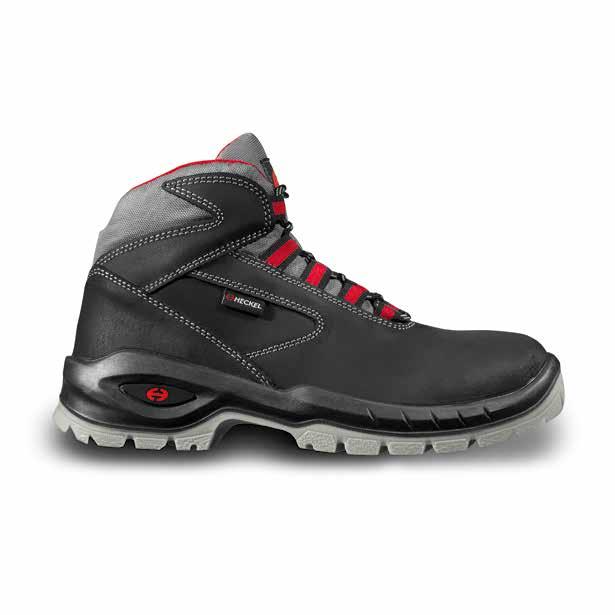 double density PU sole excellent levels of grip, self-cleaning sole profile, excellent shock absorption, injection moulded PU scuff cap water-resistant black oiled grain leather upper microfibre insert, water-resistant tongue and collar, reflective elements, non-metallic eyelets and hooks | 3D mesh lining excellent breathability, quick drying | metal-free toe cap metal-free penetrationresistant midsole anatomically shaped hygienic insole with bottom layer of 100% of recycled open cell foam | weight 630 g (LOW) and 710 g (HIGH) 42