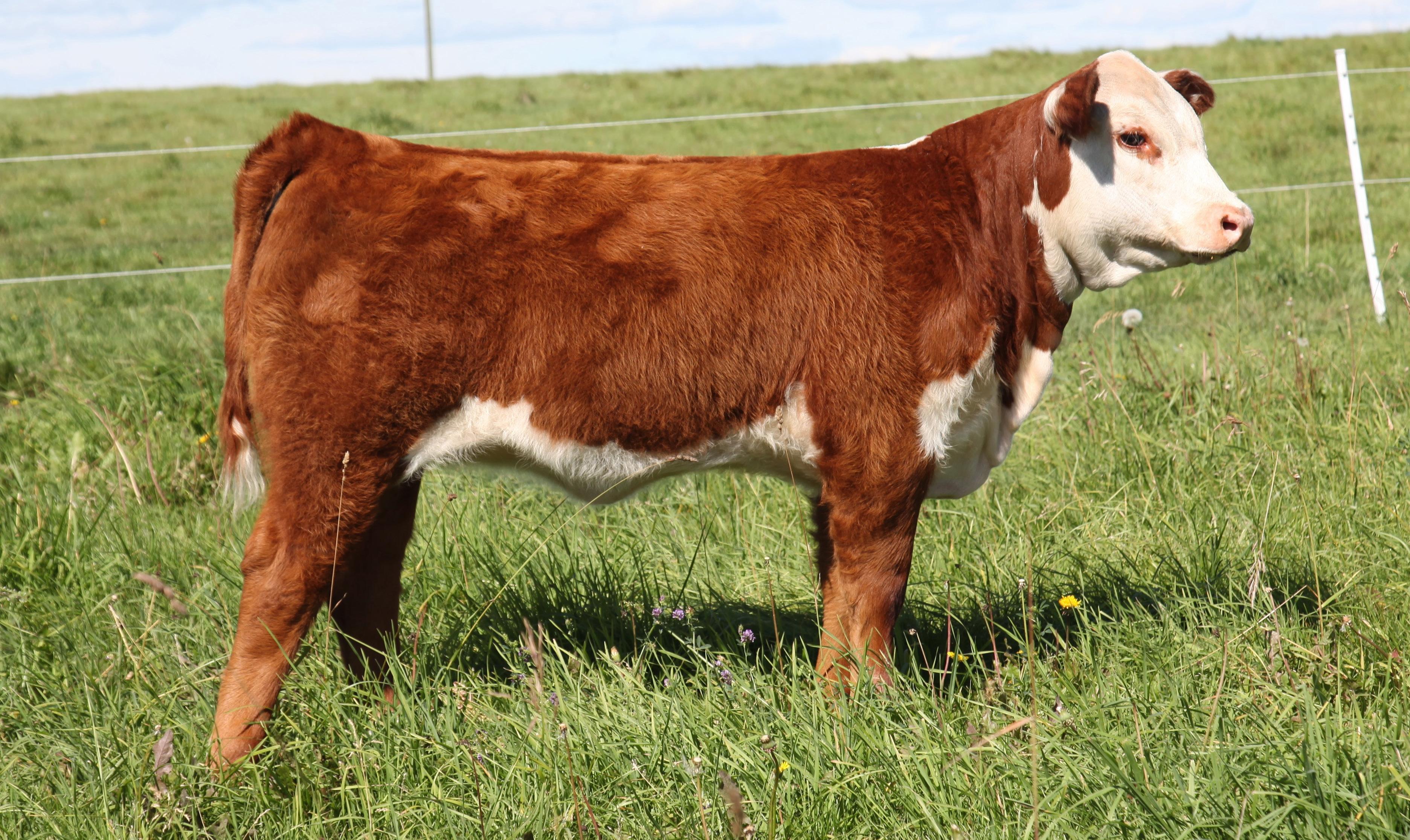 An excellent daughter of the World Champion Hereford Bull, Haymaker 35H. Her dam is a hard working cow with a super udder.