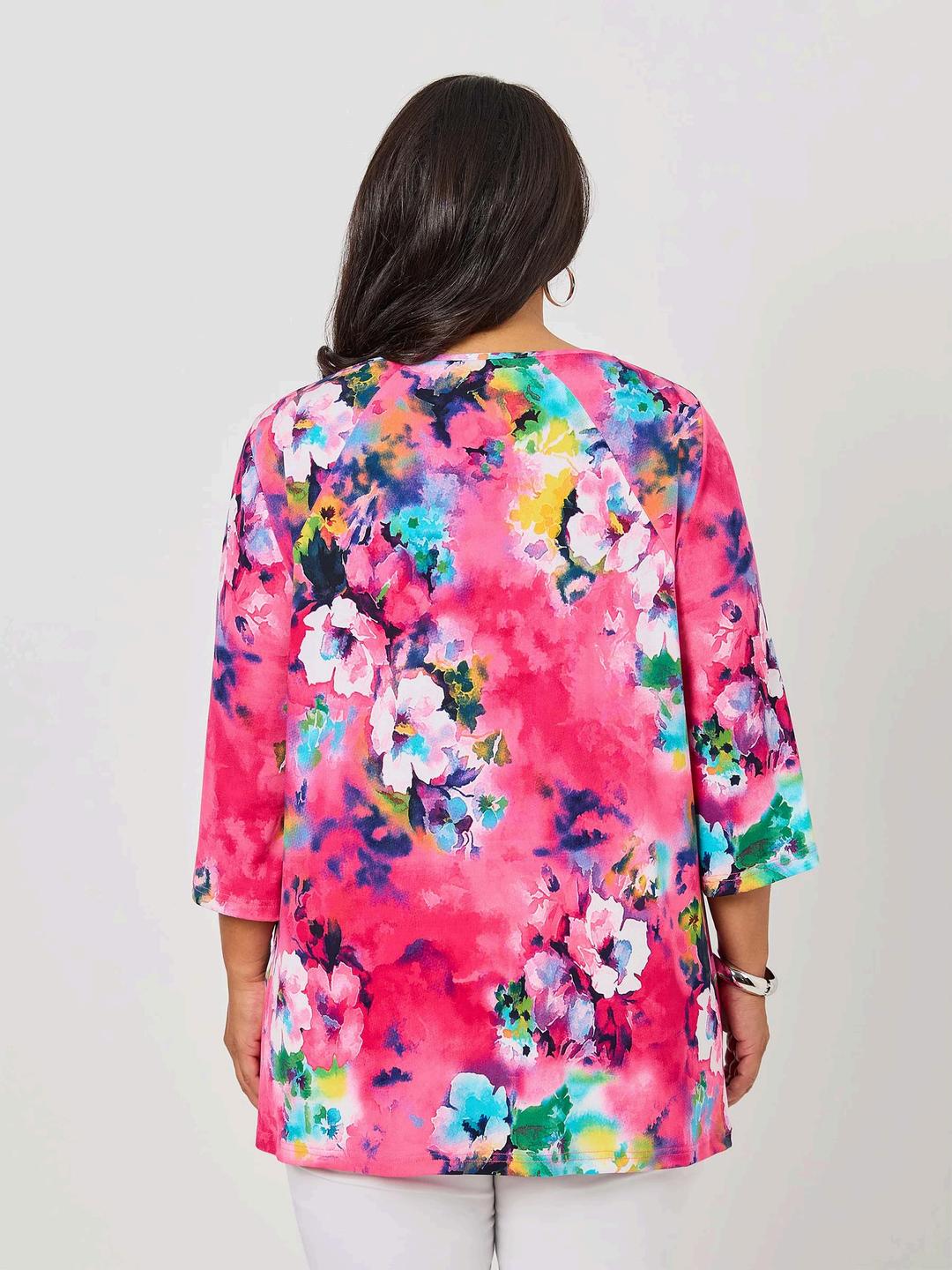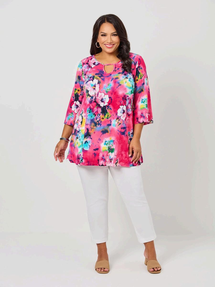 A bold fusion of contemporary design and everyday comfort. This eye-catching jersey top brings together a vibrant colour palette, a statement print, and a modern keyhole neckline to create a piece that stands out effortlessly.