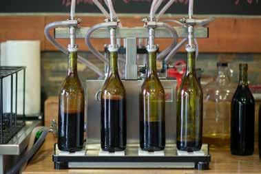 ‘Each year,’ Adrian tells me as he leads me to KJ’s wine-bottling station set up in one corner of the large retail space, ‘we import up to one hundred thousand litres of fresh juice from Europe for wine production.’ I attempt to fathom what the numbers mean. Adrian helps me out. ‘In other words,’ he explains, ‘we produce more wine in a year than many cottage wineries in Niagara produce over the same period of time.’ I’m baffled. I take a look at the bottling station –comprised of a dishwasher, large sink, four winefilling spouts, and a single corker – and marvel at how this can possibly be. I watch as KJ Assistant Manager & Production Lead Devon prepares the station by cleaning lines and gathering empty bottles for filling. She pops on the first four bottles of the day, filling them with red wine from