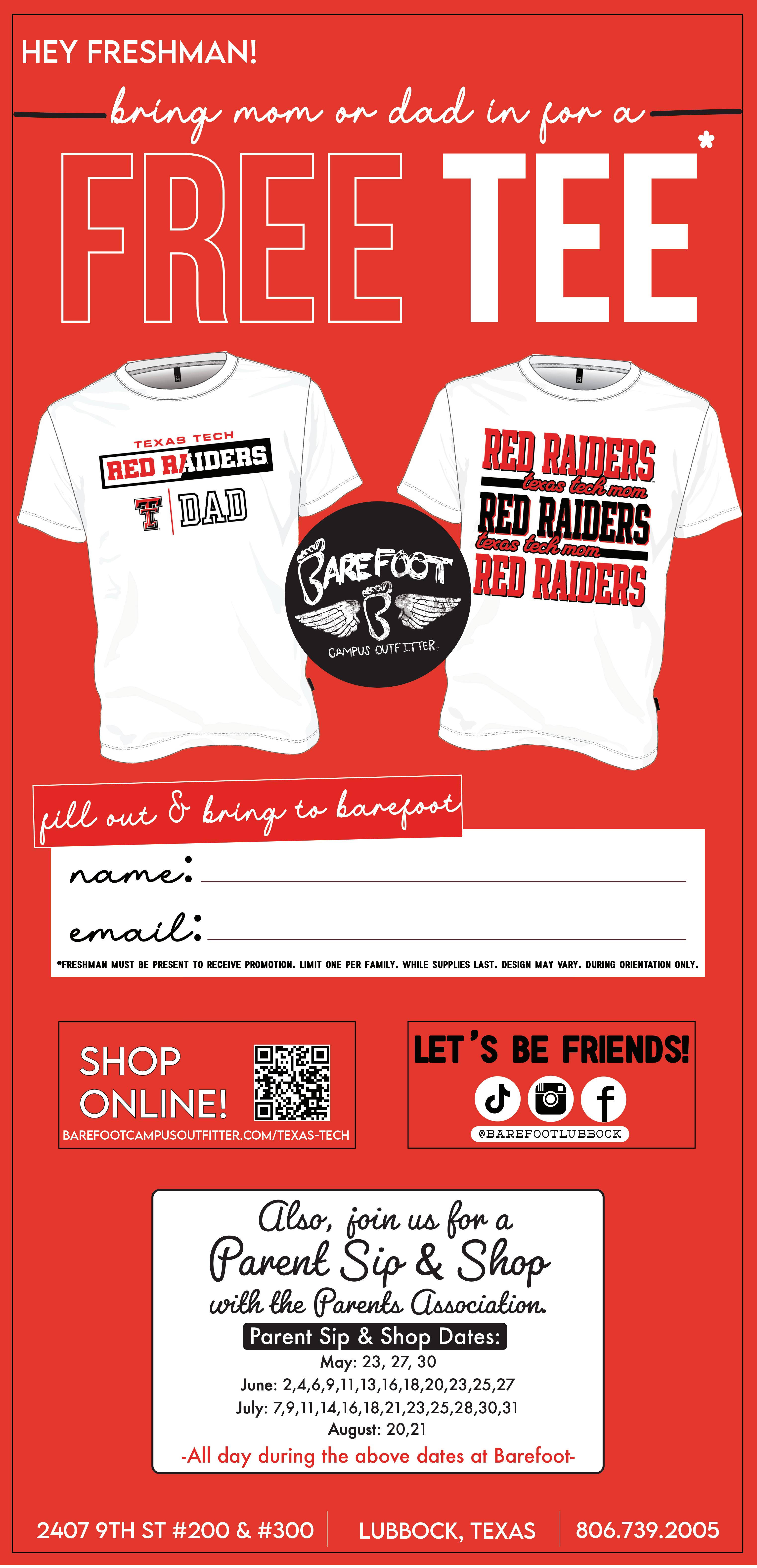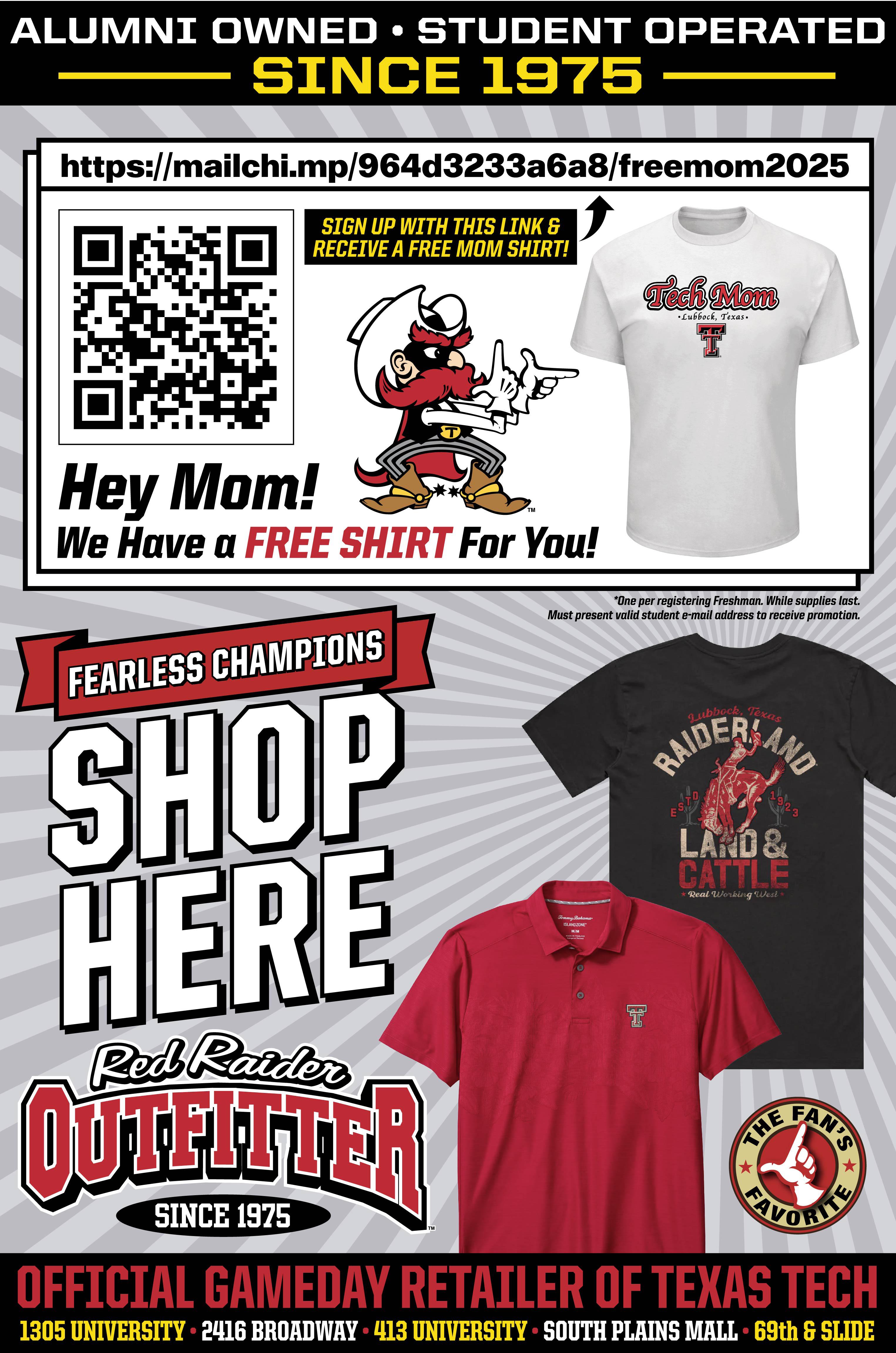 Congratulations and best wishes as you prepare for college. Make Red Raider Outfitter your first stop in Lubbock and become part of the tradition. See for yourself why RRO has been the Fan’s Favorite since 1975.”