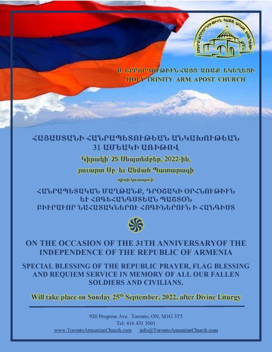 On September 21, 1991, the second Armenian Republic declared its independence from Soviet Union. The Armenian churches started to celebrate this beautiful Prayer Service not only on May 28, but also on September 21. During the Blessing of the Republic Prayer service, after the Divine Liturgy a Requiem Service is held in memory of fallen soldiers and heroes, which is followed by the Special Blessing of the Republic Prayer for the peace and prosperity of our Motherland.