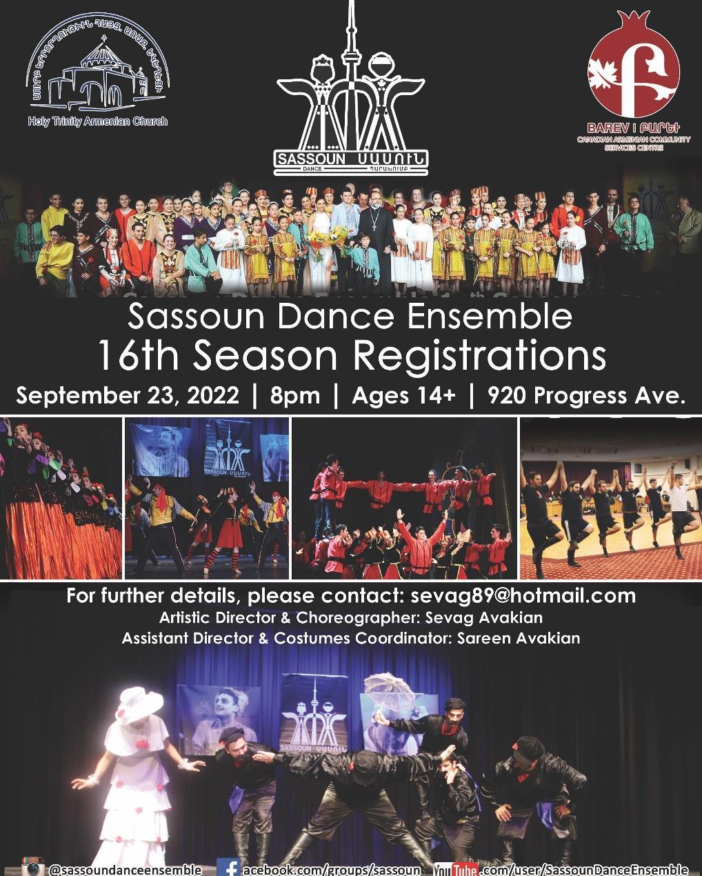 23 Registartion for 16th season of SASSOUN DANCE ENSEMBLE starts on FRIDAY, SEPTEMBER 23, 2022 AT 8 PM Stop by at 920 Progress Avenue or contact the Artistic Director and Choreographer, Sevag Avakian at sevag89@hotmail.com .
