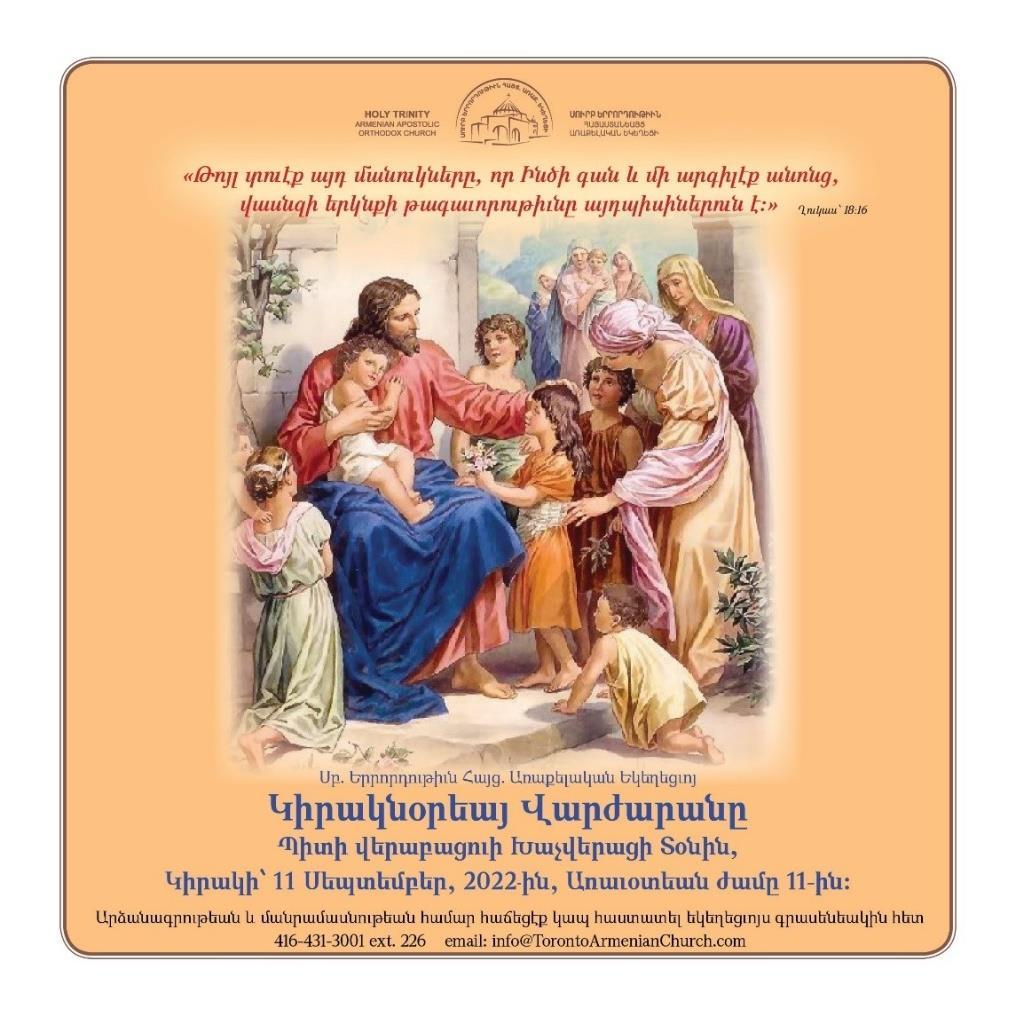 The firstdayofSunday SchoolisonFeast ofHoly Cross, September 11, 2022 and will continue every Sunday from 11:00 am to 1:00 pm at Holy Trinity Armenian Church. For information, please contact us by email: info@TorontoArmenianChurch.com or call us at 416 431 3001 ext. 3