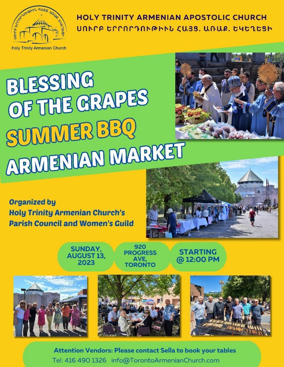 16 Սուրբ եւ Անմահ Պատարագ Առաւօտեան ժամը 10։30-ին Յաւարտ Ս. Պատարագի տեղի պիտի ունենայ Խաղողի օրհնութիւն եւ խորովածի սպասարկութիւն Եկեղեցւոյս շրջափակին մէջ Եթե կը փափաքիք խաղող նուիրել, հաճեցէք կապ հաստատել Եկեղեցւոյս գրասենեակի հետ՝ 416 431 3001 info@TorontoArmenianChurch.com