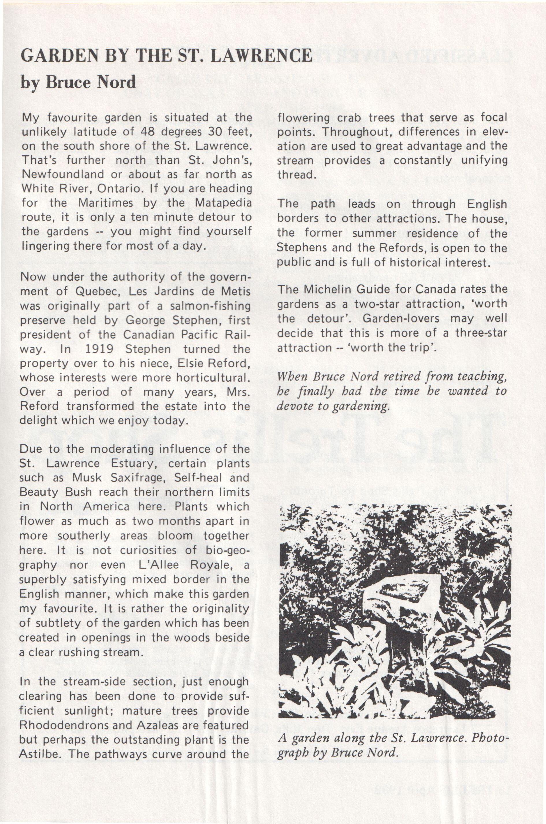 My favourite garden is situated at the unlikely latitude of 48 degrees 30 feet, on the south shore of the St. Lawrence. That's further north than St. John's, Newfoundland or about as far north as White River, Ontario. If you are heading for the Maritimes by the Matapedia route, it is only a ten minute detour to the gardens -- you might find yourself lingering there for most of a day.