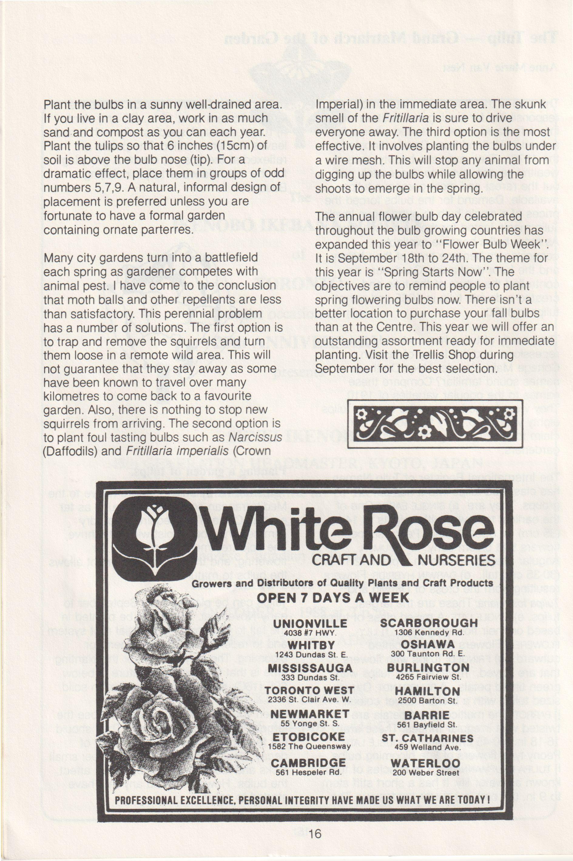 Many city gardens turn into a battlefield each spring as gardener competes with animal pest. | have come to the conclusion that moth balls and other repellents are less than satisfactory. This perennial problem has a number of solutions. The first option is to trap and remove the squirrels and turn them loose in a remote wild area. This will not guarantee that they stay away as some have been known to travel over many kilometres to come back to a favourite garden. Also, there is nothing to stop new squirrels from arriving. The second option is to plant foul tasting bulbs such as Narcissus (Daffodils) and Fritillaria imperialis (Crown