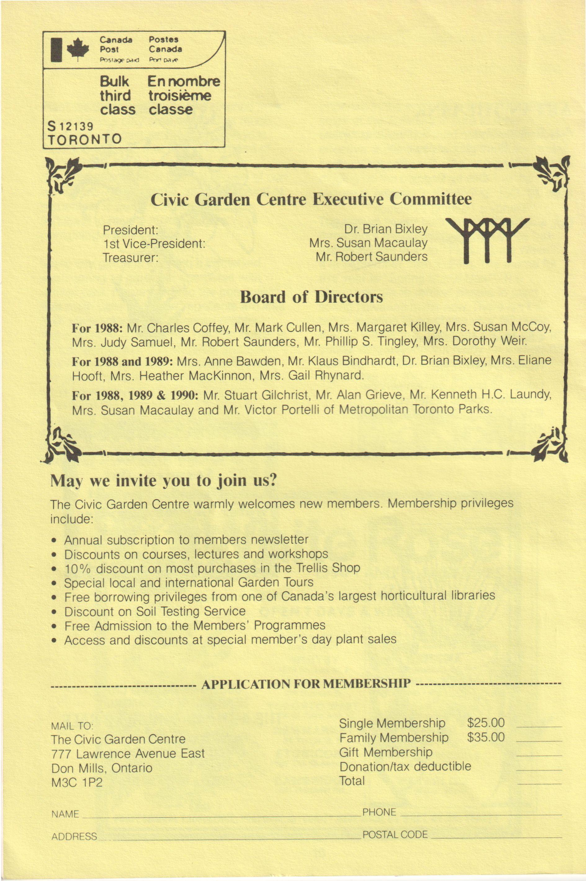 For 1988, 1989 & 1990: Mr. Stuart Gilchrist, Mr. Alan Grieve, Mr. Kenneth H.C. Laundy, Mrs. Susan Macaulay and Mr. Victor Portelli of Metropolitan Toronto Parks.
