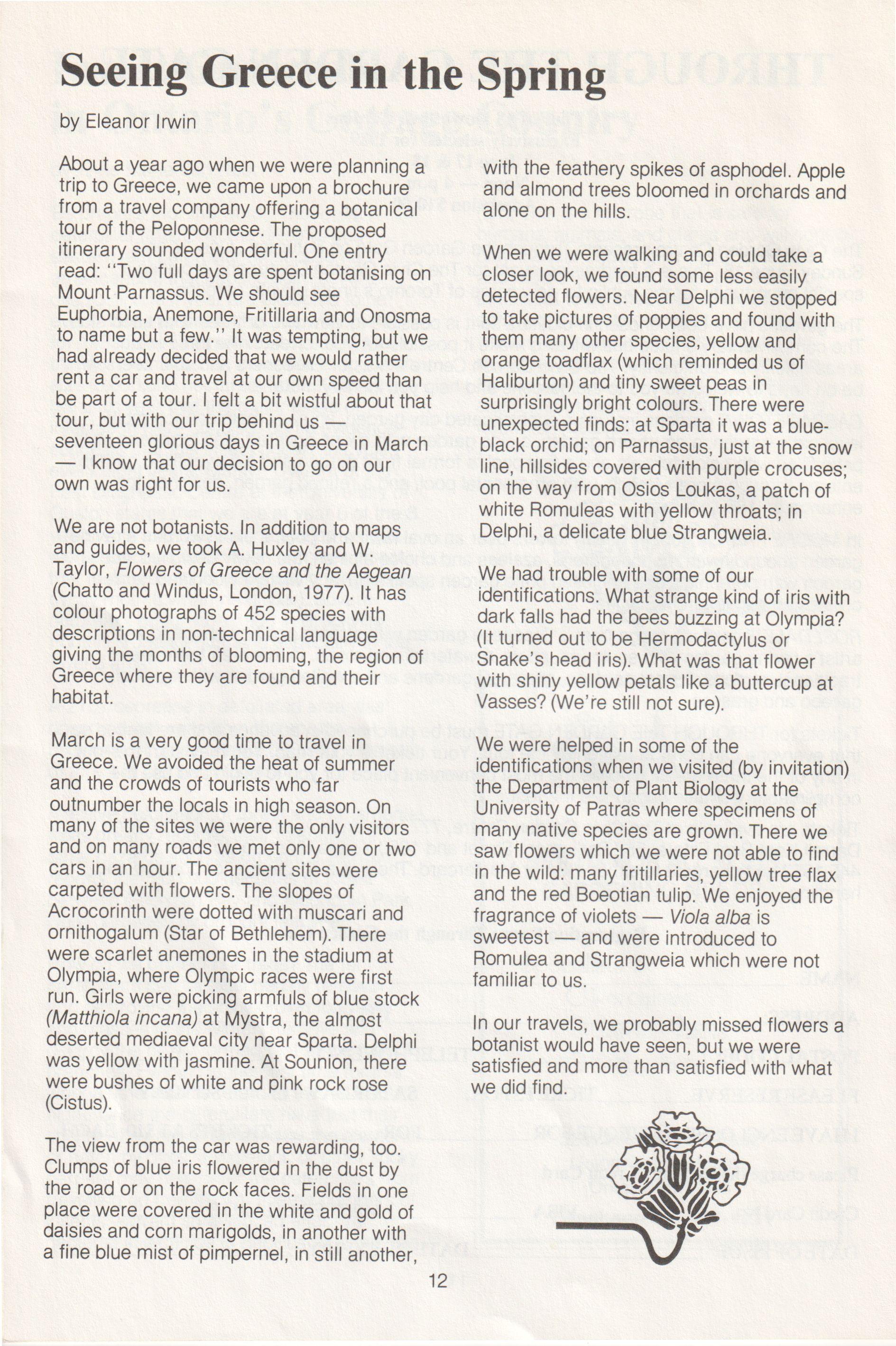We are not botanists. In addition to maps and guides, we took A. Huxley and W. Taylor, Flowers of Greece and the Aegean (Chatto and Windus, London, 1977). It has colour photographs of 452 species with descriptions in non-technical language giving the months of blooming, the region of Greece where they are found and their habitat.
