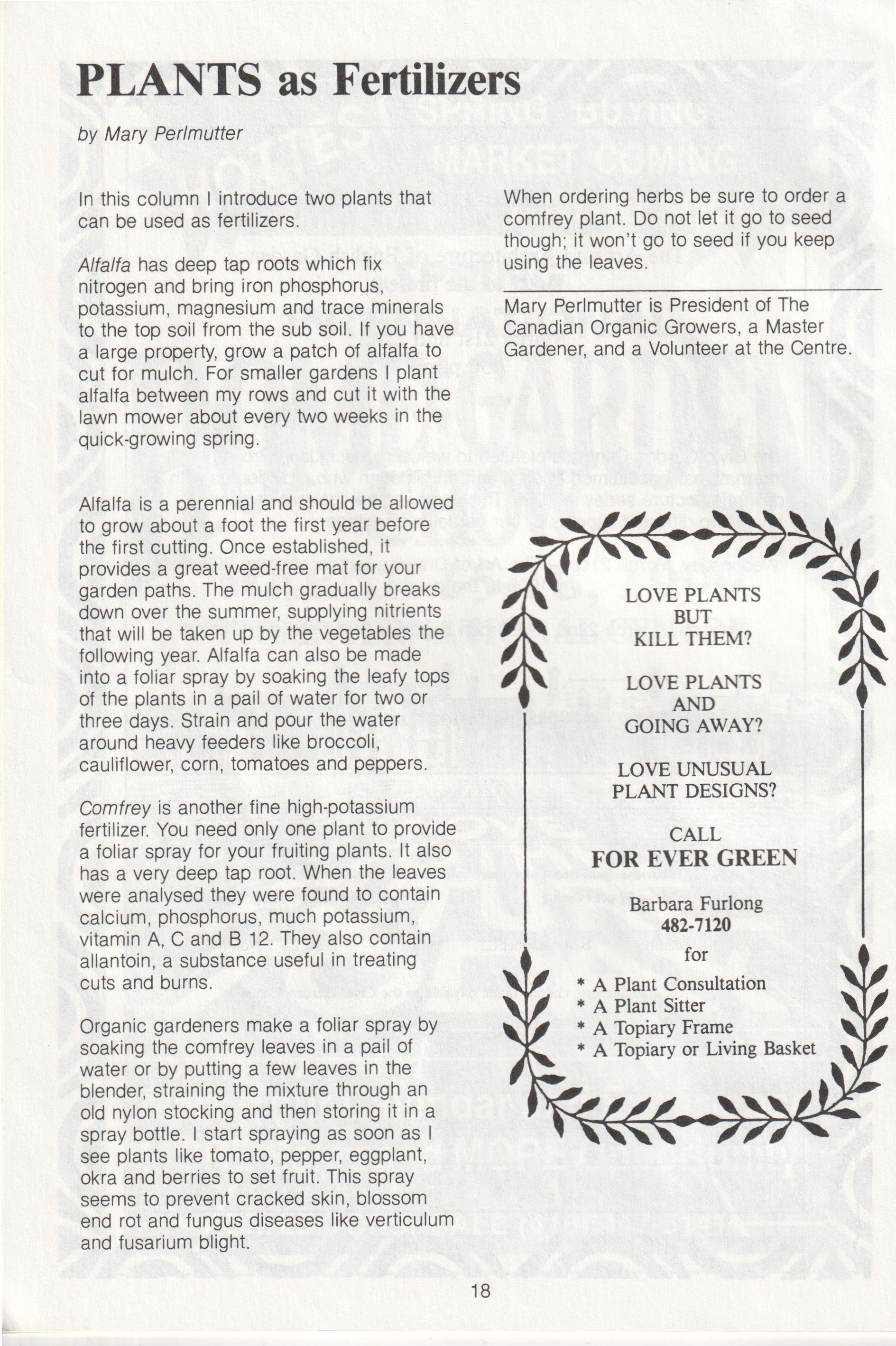 Comfrey is another fine high-potassium fertilizer. You need only one plant to provide a foliar spray for your fruiting plants. It also has a very deep tap root. When the leaves were analysed they were found to contain calcium, phosphorus, much potassium, vitamin A, C and B 12. They also contain allantoin, a substance useful in treating cuts and burns.
