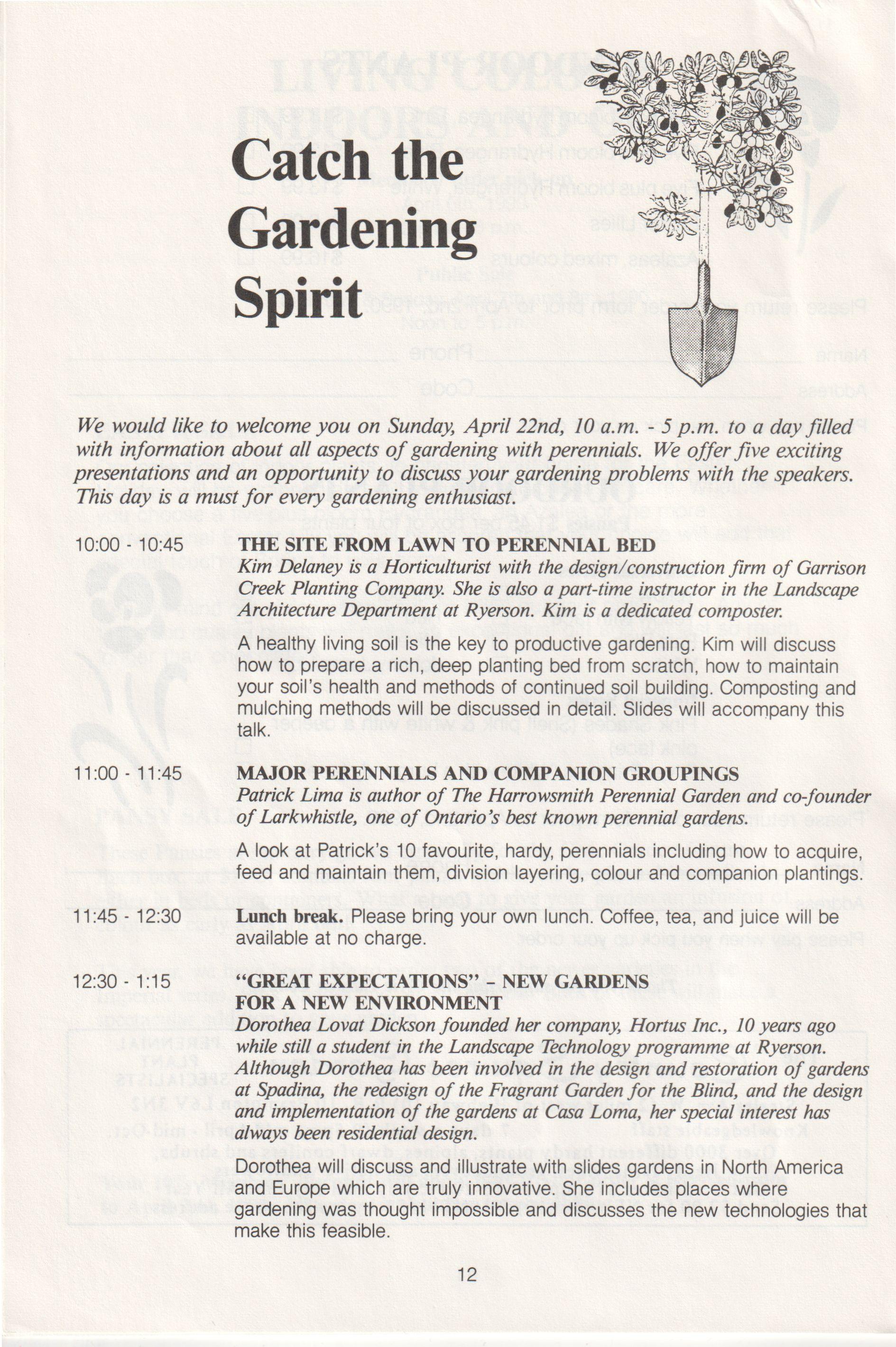 Soon to become a regular visitor to the Centre, John Brookes taught a landscape design workshop for two weeks in January of 1987. While here, Mr. Brookes spoke on his newest book The Indoor Garden at the Members Programme. January 1987 saw the retirement of Grace Tughan. A valued part of the Centre for over 20 years, Mrs. Tughan was the secretary for seven Executive Directors and watched the membership grow from 300 to 3,500. Another new event at the Centre was a one-day seminar series called Catch the Gardening Spirit". Filled with inspirational ideas for gardeners, this day certainly succeeded. Patrick Lima returned to speak on his renowned garden Larkwhistle . Trellis takes on a new larger size and cleaner look in March. In celebration of