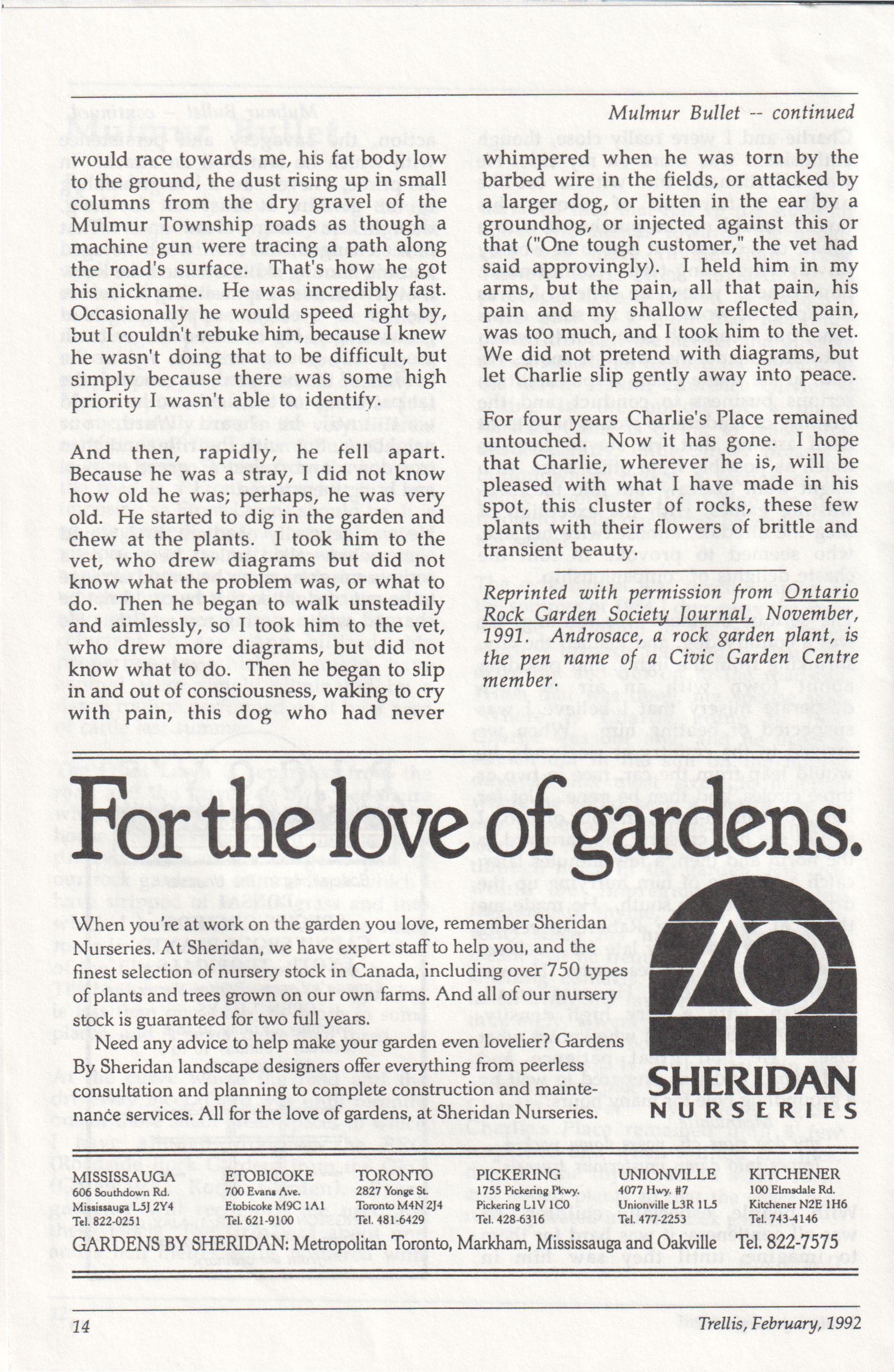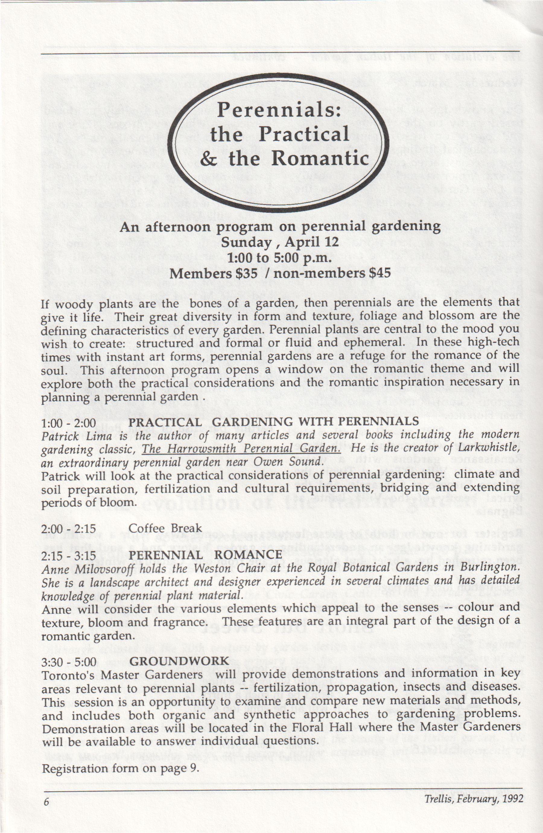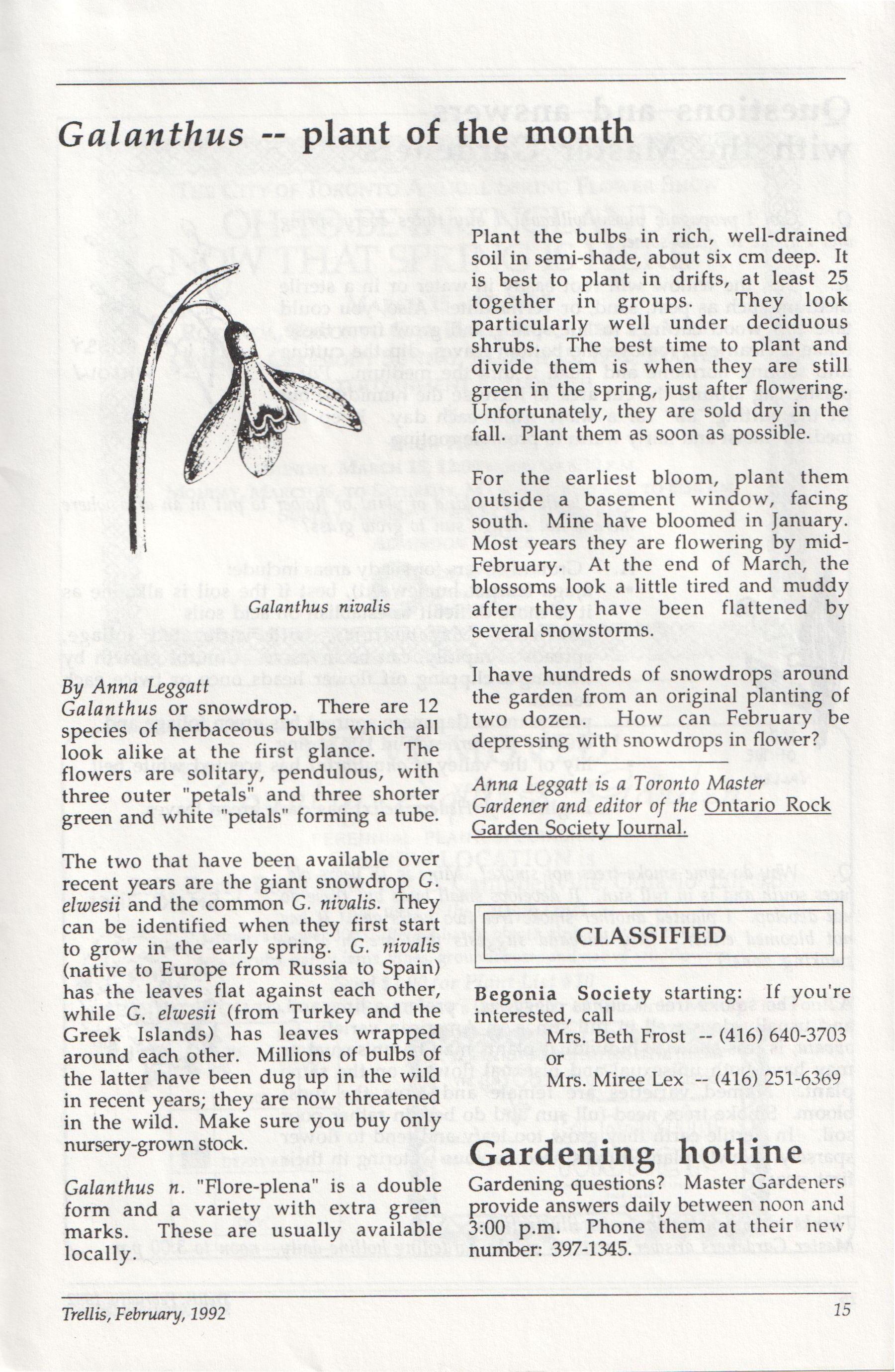 The newsletter of the Civic Garden Centre in Metropolitan Toronto February, 1992 Volume 19, Number 2