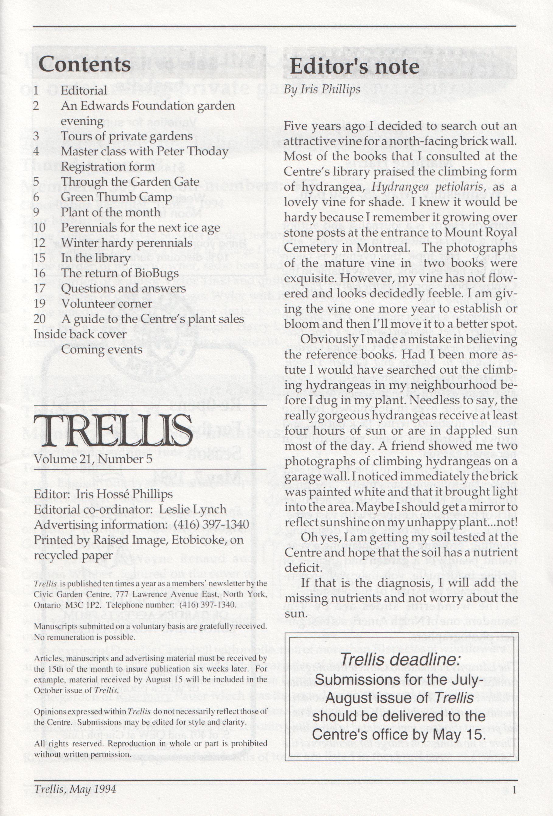 Trellis is published ten times a year as a members newsletter by the Civic Garden Centre, 777 Lawrence Avenue East, North York, Ontario M3C 1P2. Telephone number: (416) 397-1340.