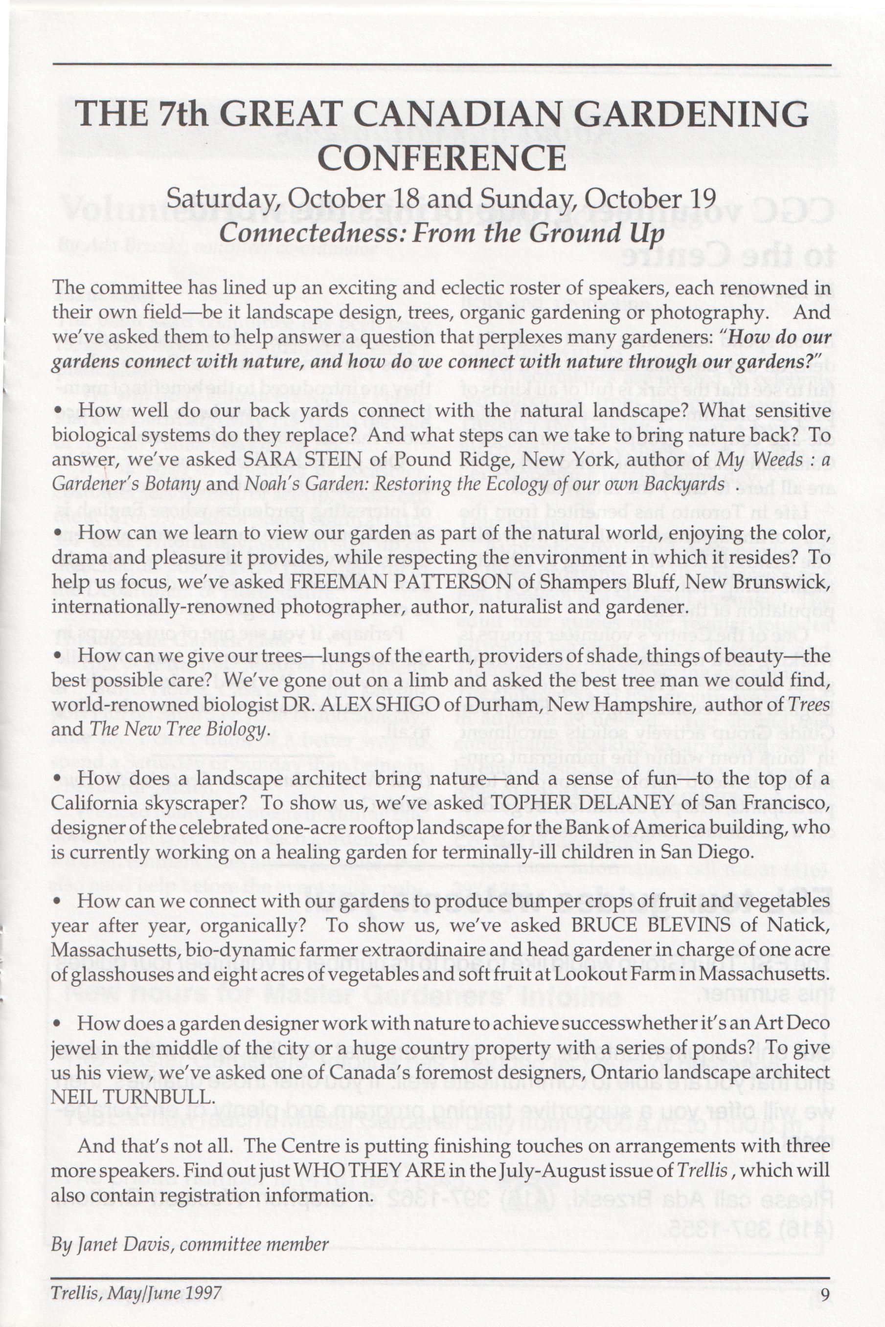 Early on in my involvement with the Centre, I was invited to be part of a discussion about the 7th GreatCanadian GardeningConference,October18and19.Ibecame