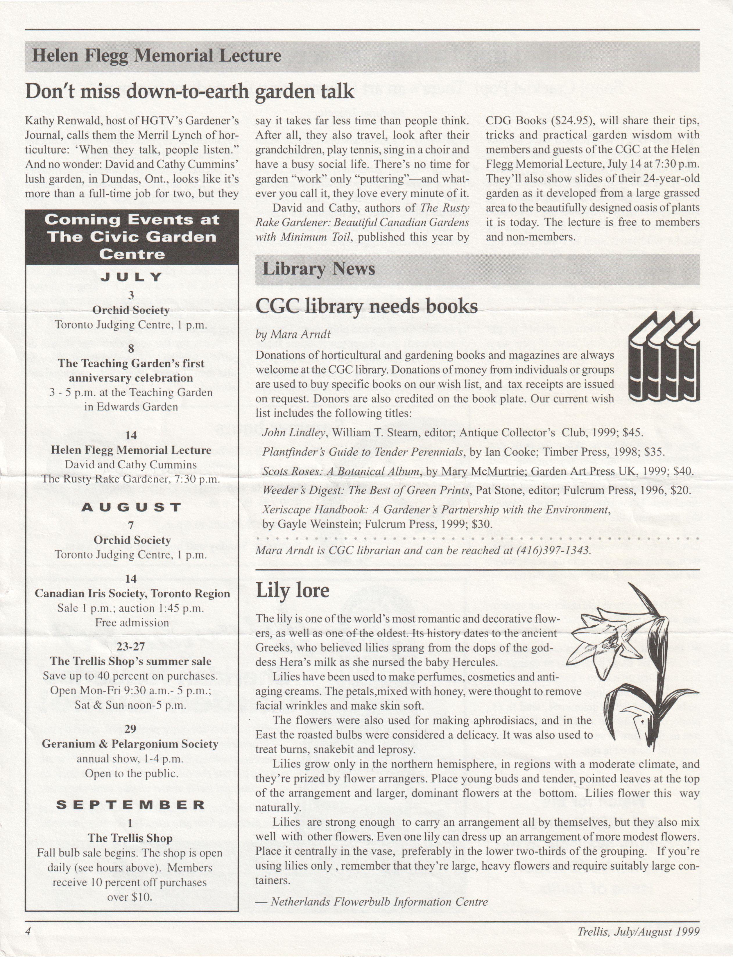 CDG Books ($24.95), will share their tips, tricks and practical garden wisdom with members and guests ofthe CGC at the Helen Flegg Memorial Lecture, July 14 at 7:30 p.m. They ll also show slides oftheir 24-year-old garden as it developed from a large grassed areato thebeautifully designedoasisofplants it is today. The lecture is free to members and non-members.