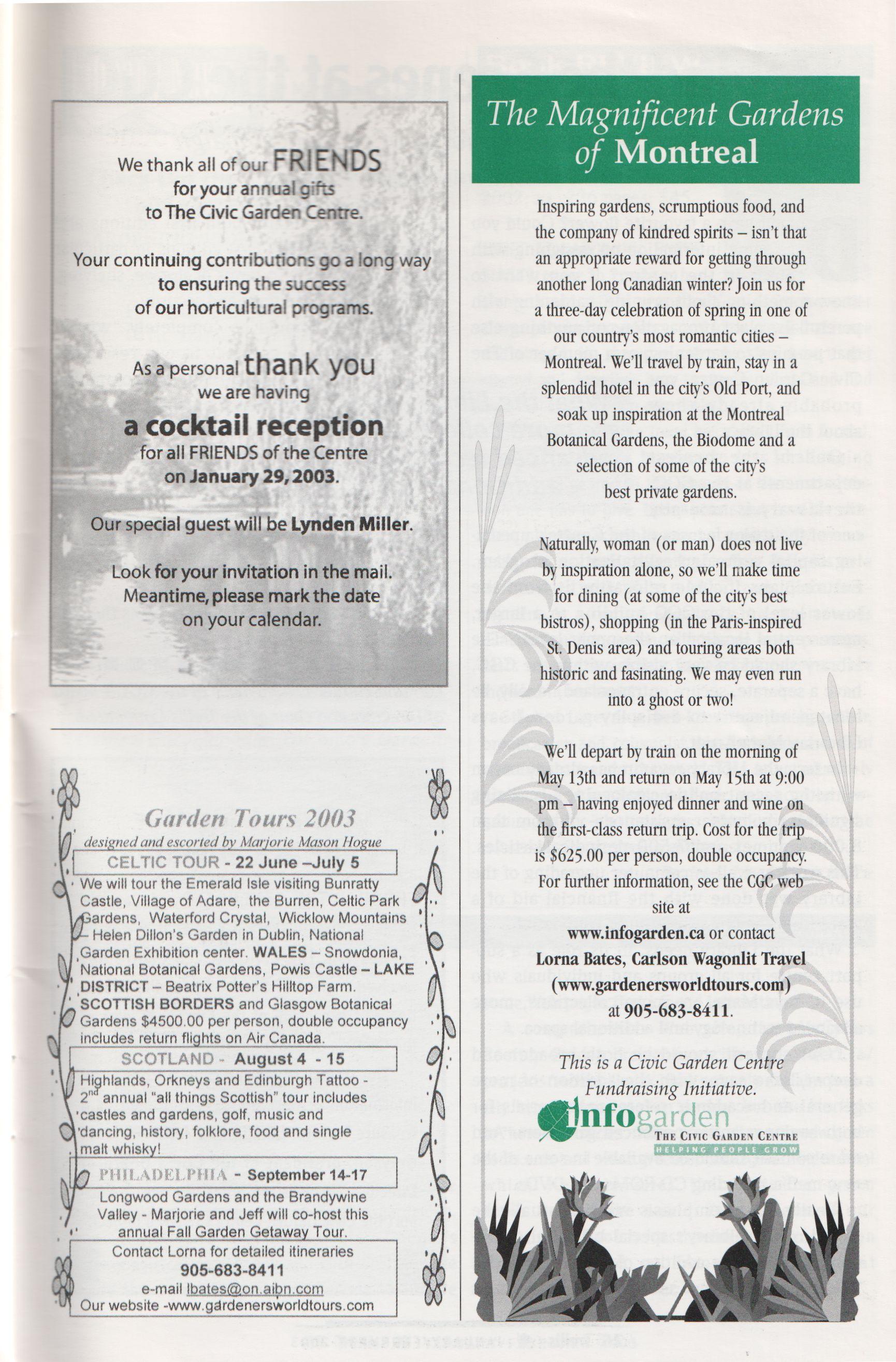 Tickets: $25 members / $30 public, on sale in May 2003, in The Civic Garden Centre s Trellis Shop, 777 Lawrence Ave. East, Toronto or by calling 416-397-1340.