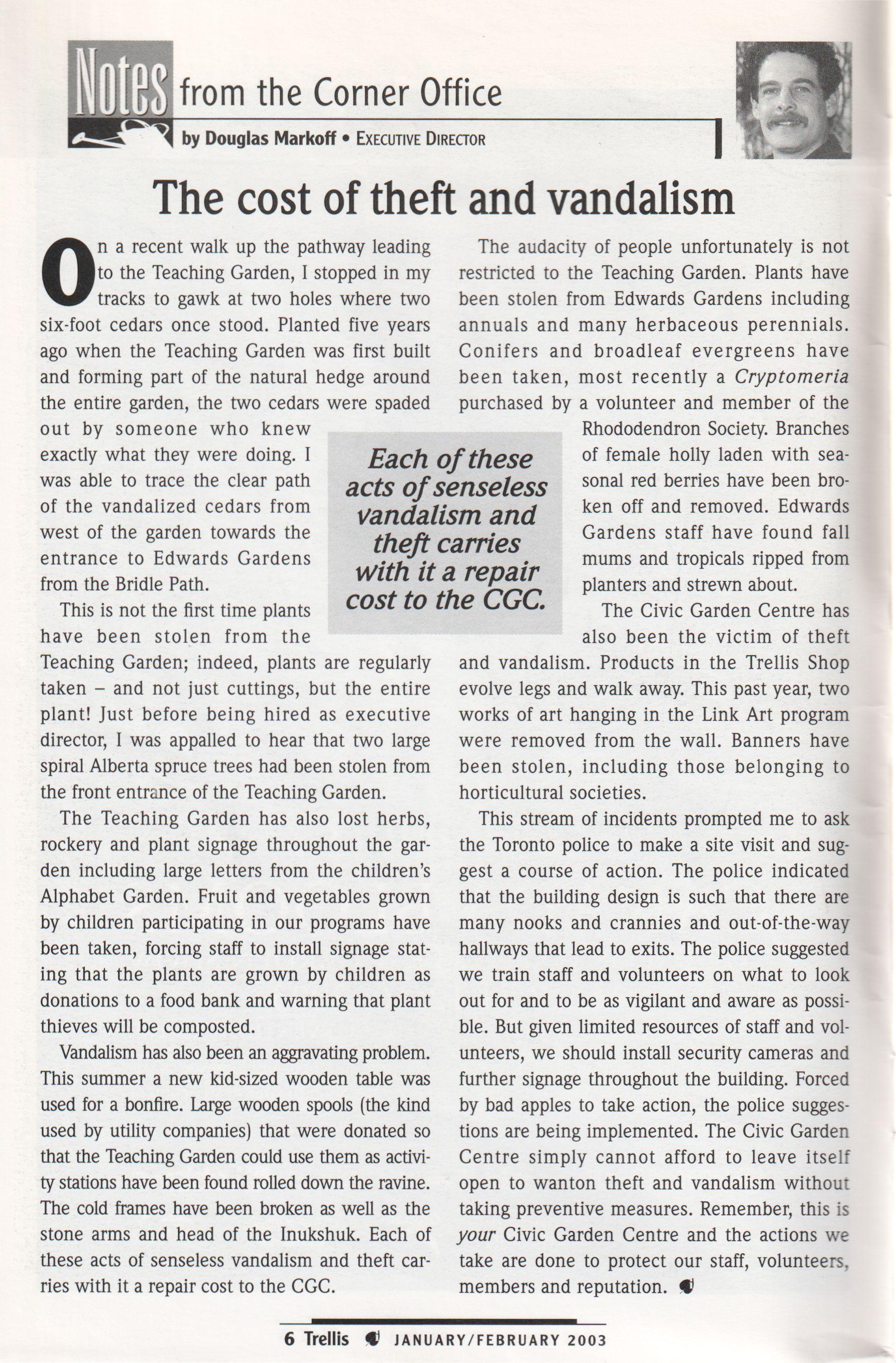 The Civic Garden Centre has also been the victim of theft and vandalism. Products in the Trellis Shop evolve legs and walk away. This past year, two works of art hanging in the Link Art program were removed from the wall. Banners have been stolen, including those belonging to horticultural societies.