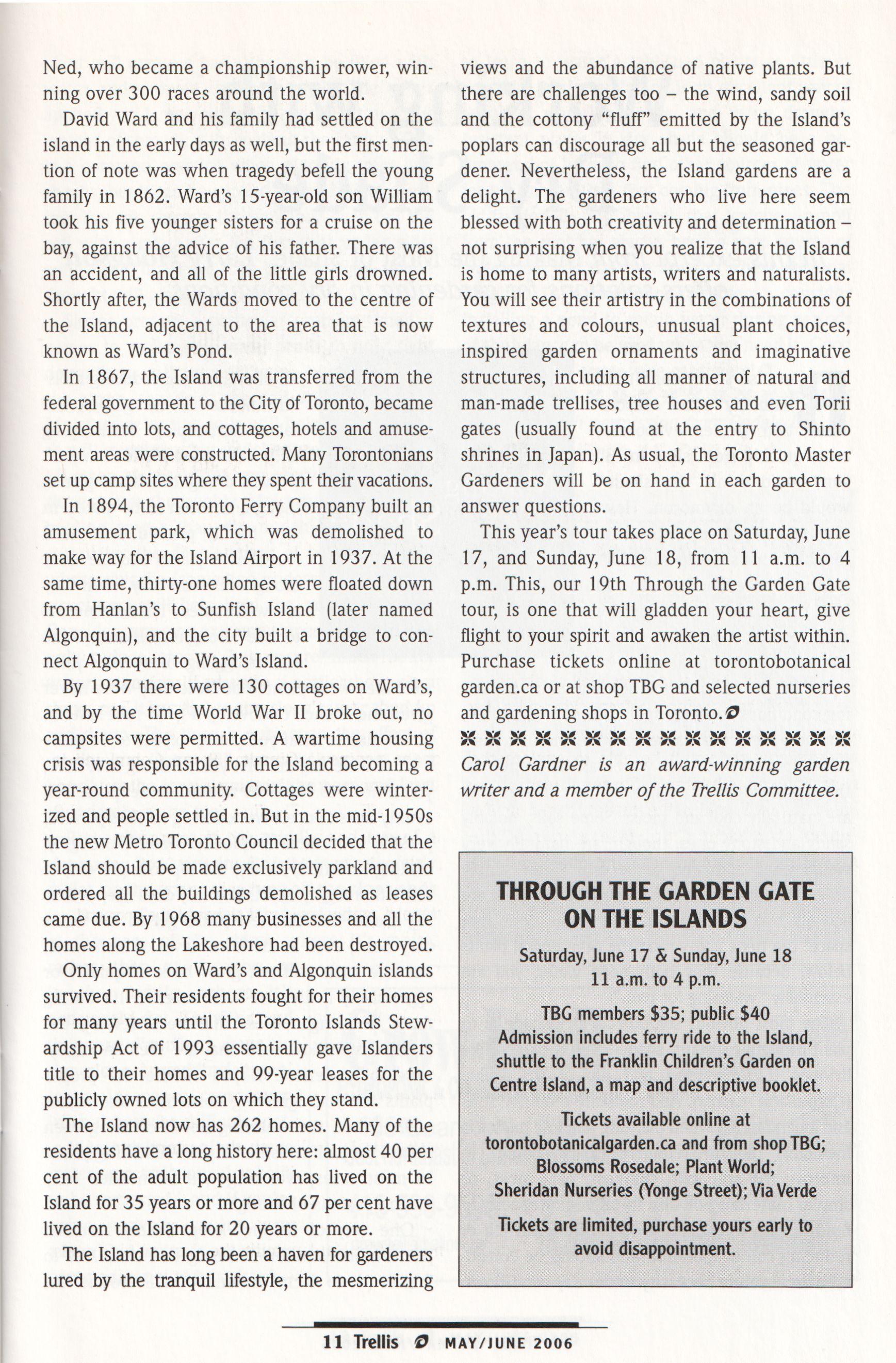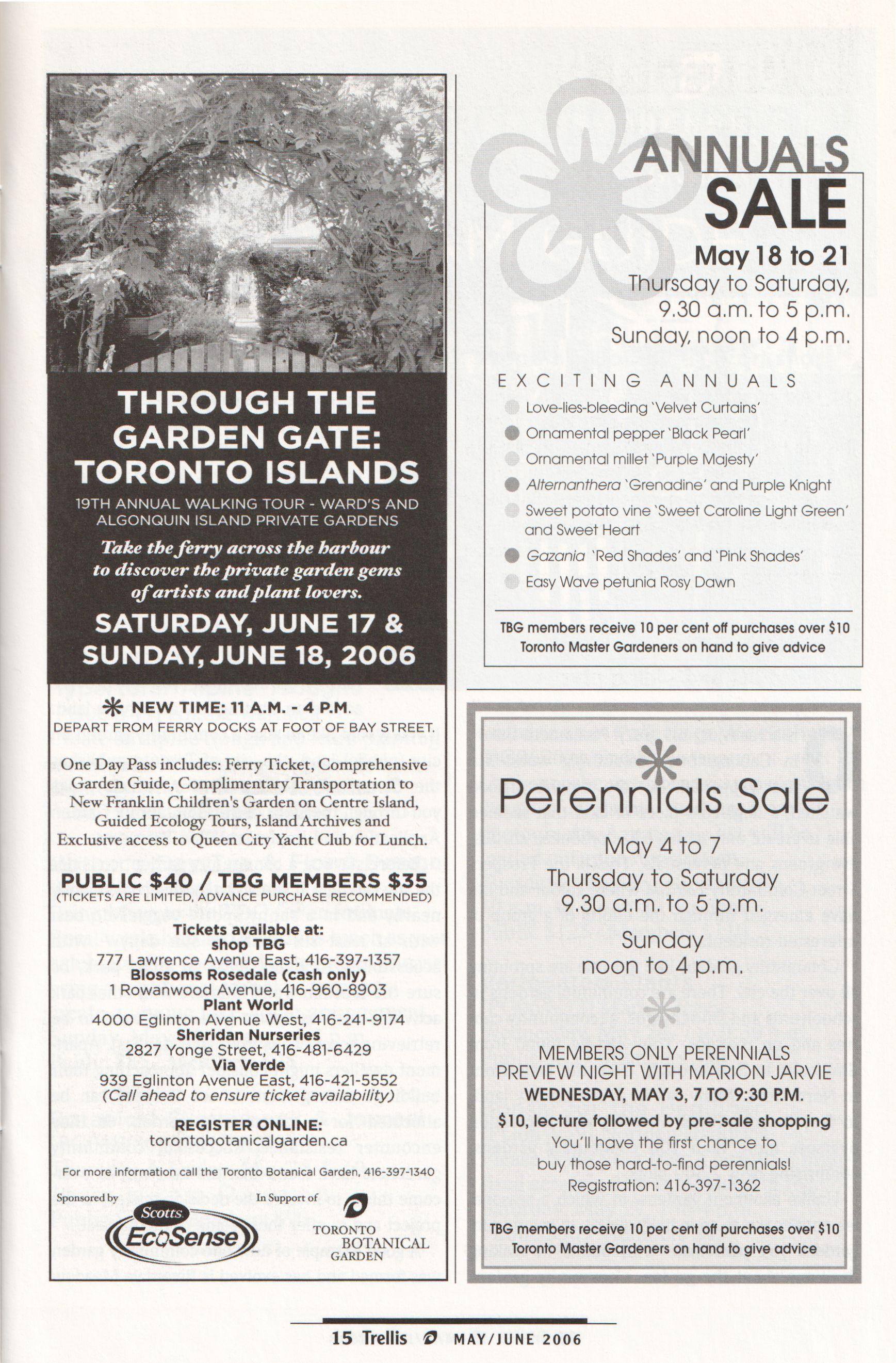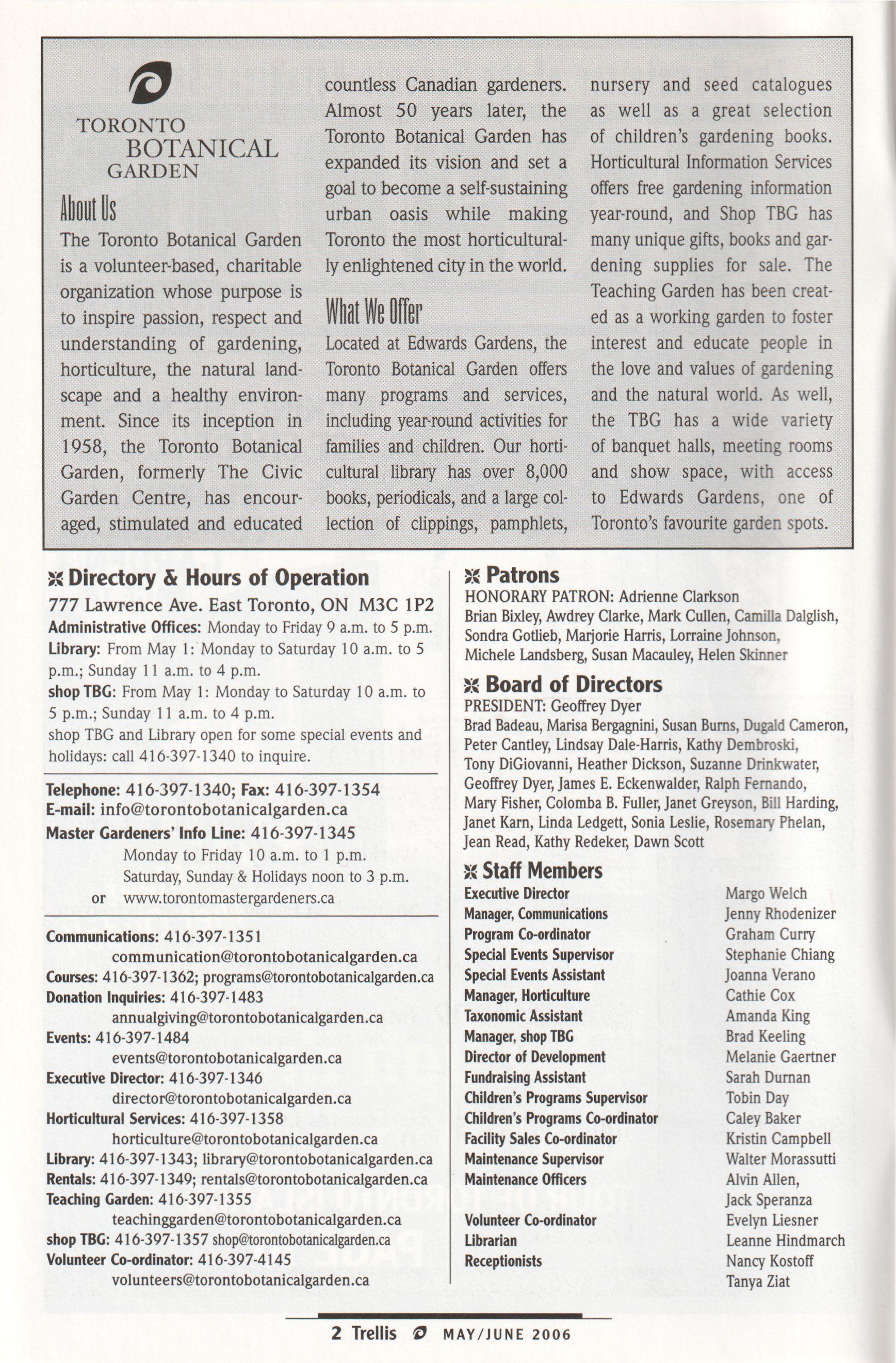 Trellis is published six times a year as a members newsletter by the Toronto BotanicalGarden at ~Edwards Gardens. 777Lawrence AvenueEast,Toronto, Ontario M3C 1P2,416-397-1340.