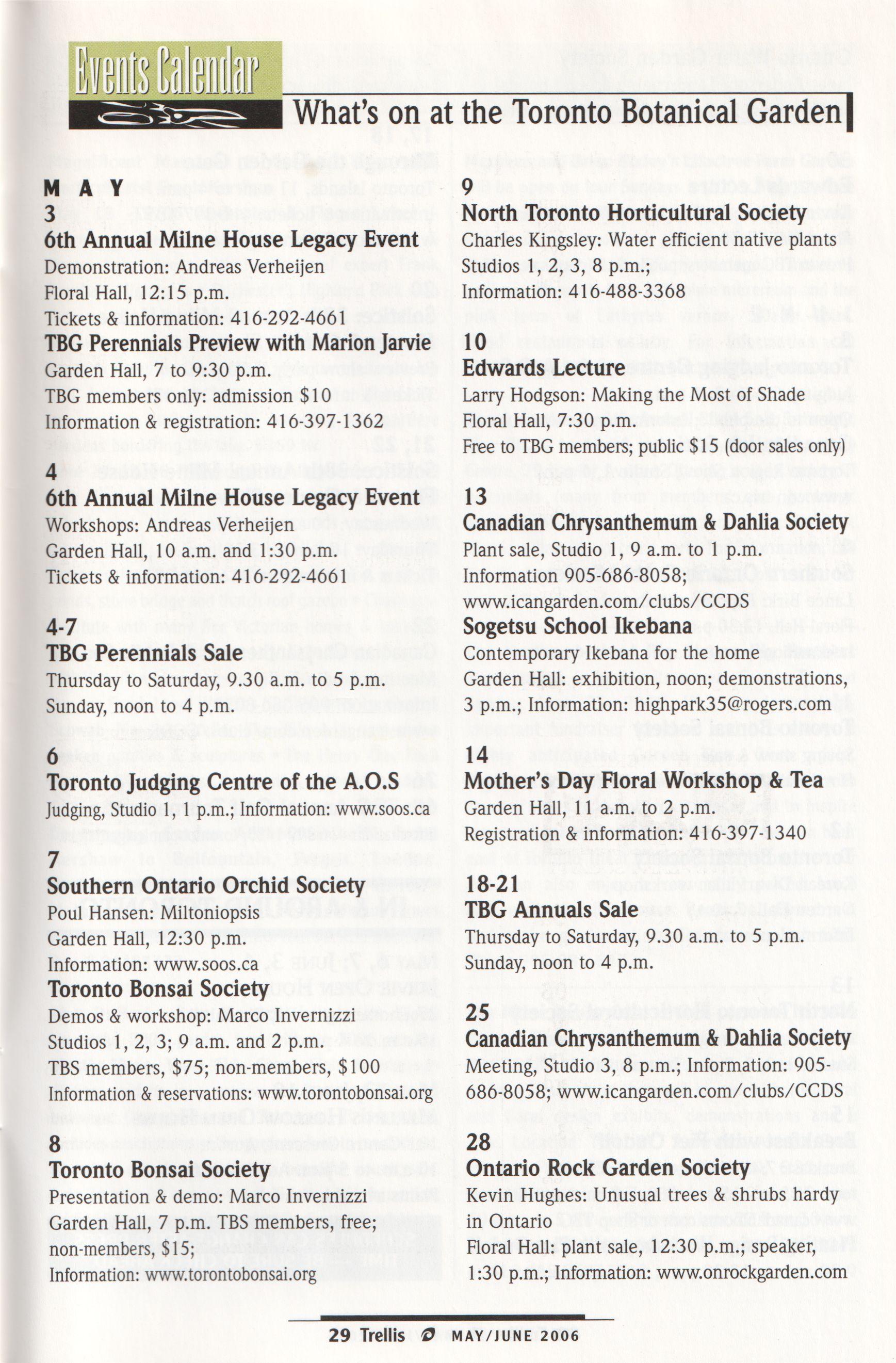 The Dufferin Arts Council follows its highly successful 2004 garden tour with its 2006 version: Mostly Mono; West Side Story. Eight fascinatingly diverse gardens in a narrow band around Hwy. 10 between Orangeville and Primrose. Tickets, $15, includes descriptions of the gardens, how to reach them, where to eat. A great day in beautiful countryside. June 24 from 10 a.m. to 4 p.m.Tickets and information: DAC2006 Garden Tour, 4045 Conc.10, S.Nott., R3 Shelburne, ON LON 1S7; 705-466-6233; bmann@sympatico.ca