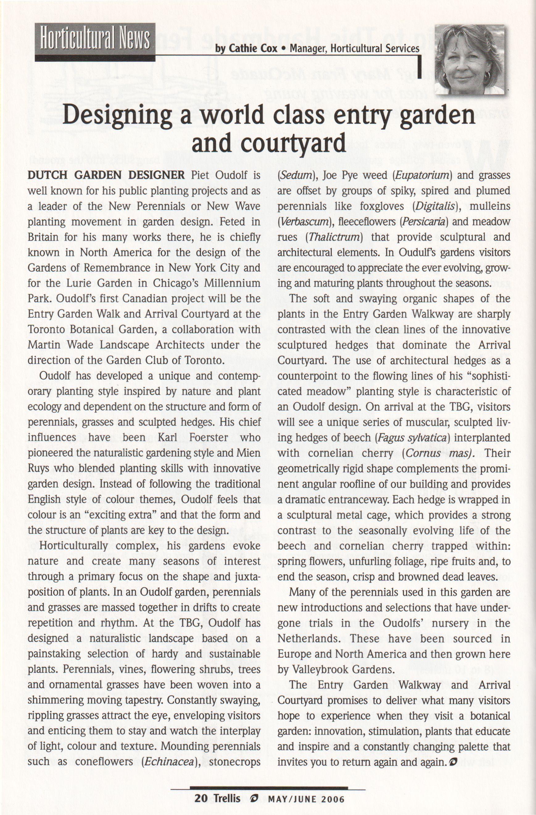 The Garden Club ofToronto s gift encompasses two areas. The first is the Arrival Courtyard, a multi-functional space that will serve as the central gathering area and entrance to the building and gardens. The second is the Entry Garden Walk, which brings a sense of occasion to the visitor s passage from parking and pedestrian access points, while providing comfortable places to sit and view the surrounding gardens. The planting of these gardens will take place in June, when Piet Oudolf will be on site to oversee their installation. (See p. 20 for more about these gardens.)