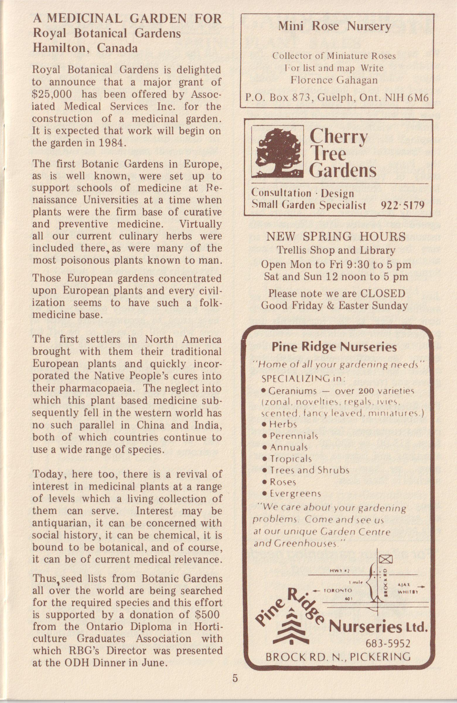 Royal Botanical Gardens is delighted to announce that a major grant of $25,000 has been offered by Associated Medical Services Inc. for the construction of a medicinal garden. It is expected that work will begin on the garden in 1984.