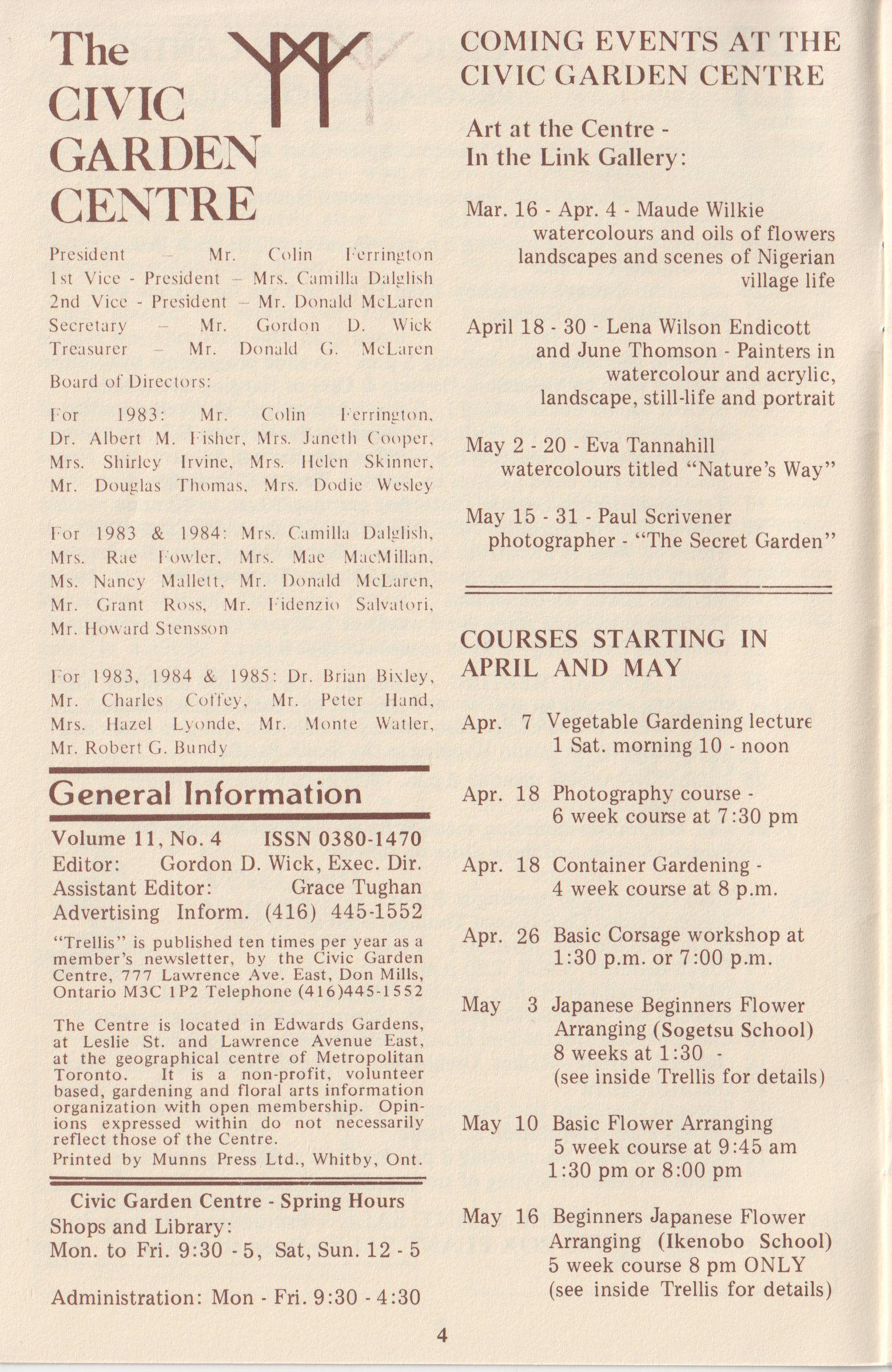 The Centre is located in Edwards Gardens, at Leslie St. and Lawrence Avenue East, at the geographical centre of Metropolitan Toronto. It is a non-profit, volunteer based, gardening and floral arts information organization with open membership. Opinions expressed within do not necessarily reflect those of the Centre. Printed by Munns Press Ltd., Whitby, Ont.