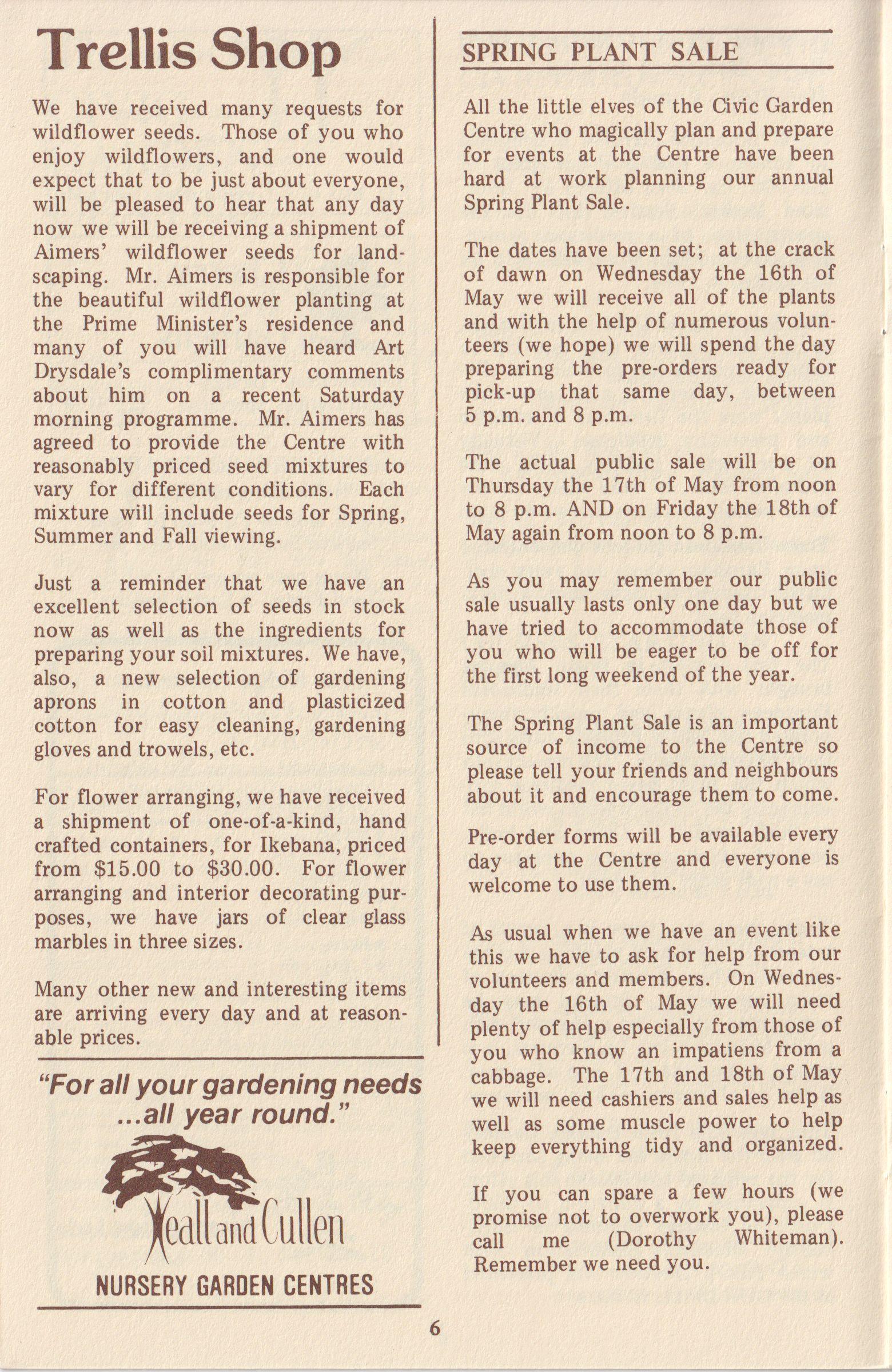 After the Garden Club s show, the Centre volunteers will again be pressed into service, organizing and manning the Spring Plant Sale - our major spring fund raiser. Please see the article on page 6 for more details.