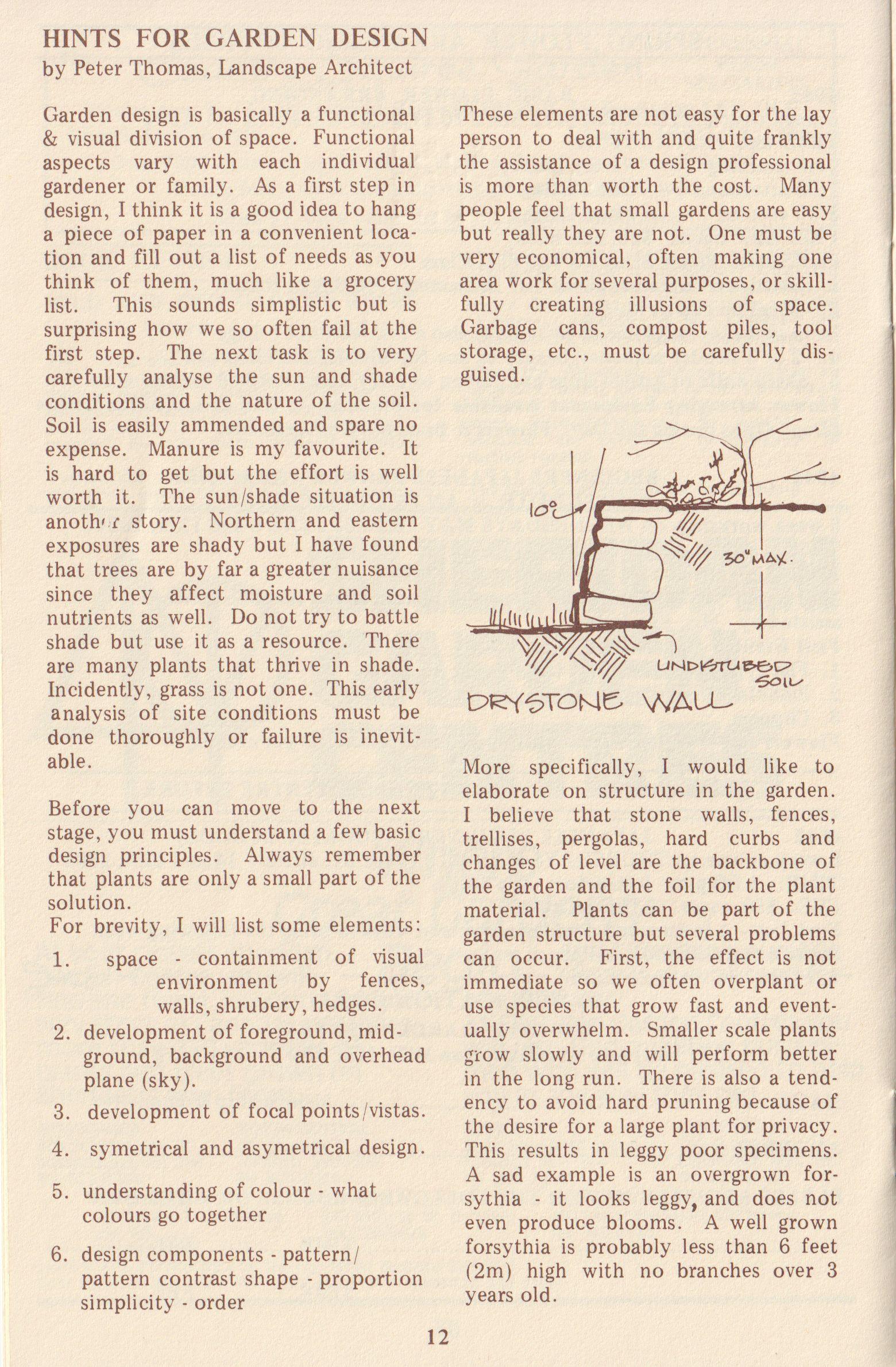 Garden design is basically a functional & visual division of space. Functional aspects vary with each individual gardener or family. As a first step in design, I think it is a good idea to hang a piece of paper in a convenient location and fill out a list of needs as you think of them, much like a grocery list. This sounds simplistic but is surprising how we so often fail at the first step. The next task is to very carefully analyse the sun and shade conditions and the nature of the soil. Soil is easily ammended and spare no expense. Manure is my favourite. It is hard to get but the effort is well worth it. The sun/shade situation is anothr.¢ story. Northern and eastern exposures are shady but I have found that trees are by far a greater nuisance since they affect moisture and soil nutrients as well. Do not try to battle shade but use it as a resource. There are many plants that thrive in shade. Incidently, grass is not one. This early analysis of site conditions must be done thoroughly or failure is inevitable.