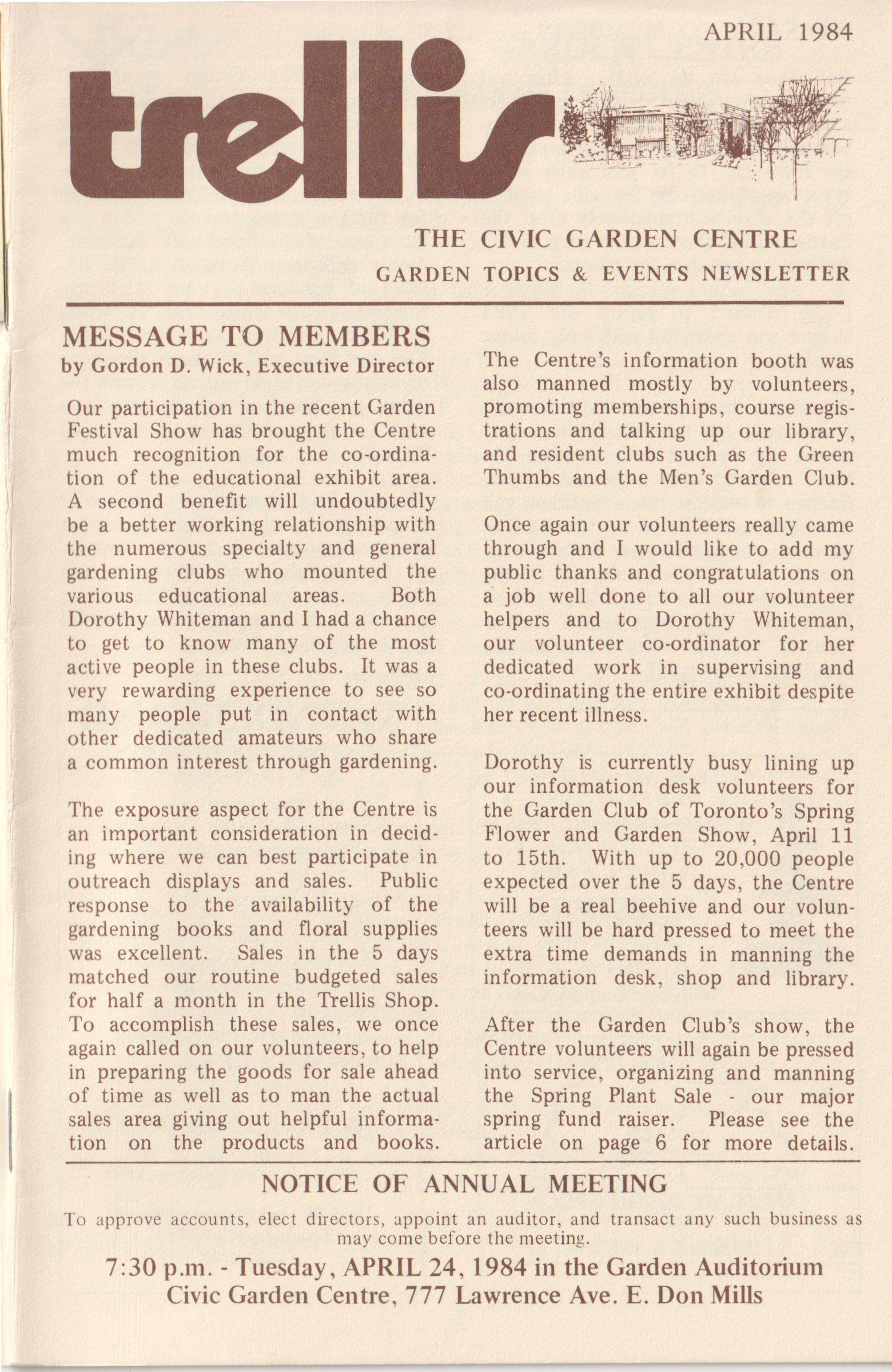 Trellis is published ten times per year as a member s newsletter, by the Civic Garden Centre, 777 Lawrence Ave. East, Don Mills, Ontario M3C 1P2 Telephone (416)445-1552