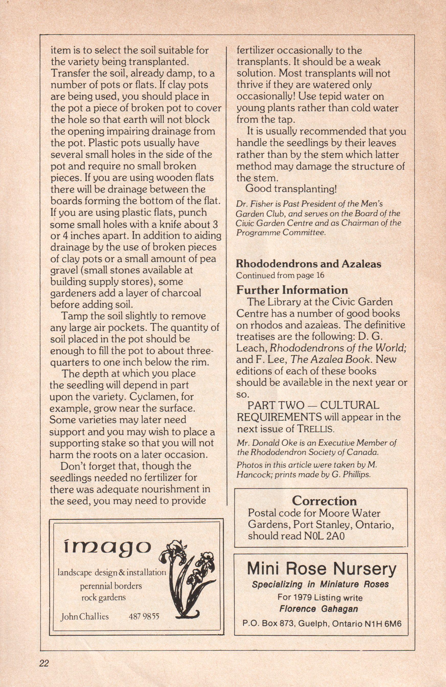 The largest public display in the Toronto area is located in Edwards Gardens, at Lawrence Avenue and Leslie Street. Almost all of the rhodos and azaleas are in beds or in the adjacent woods at the bottom of the valley along the west side of the creek, running south of Lawrence Avenue for about one third of a mile. There are now about 400 rhodos and azaleas in Edwards Gardens, most of which have been supplied and planted by members ofthe Toronto Regional Group of the Rhododendron Society of Canada in cooperation with the Metro Toronto Parks Department. For a history of this project see the article by Ken Duncan inTRELLIS ofJune 1977. There is a smaller group ofrhodos in James Gardens, in Etobicoke east ofRoyal York Road, south ofEglinton Avenue. Outside of Toronto, there are displays in Hamilton s Royal Botanical Gardens, at the Vineland Horticultural Research Institute, and in the Dominion Experimental Farm in Ottawa.
