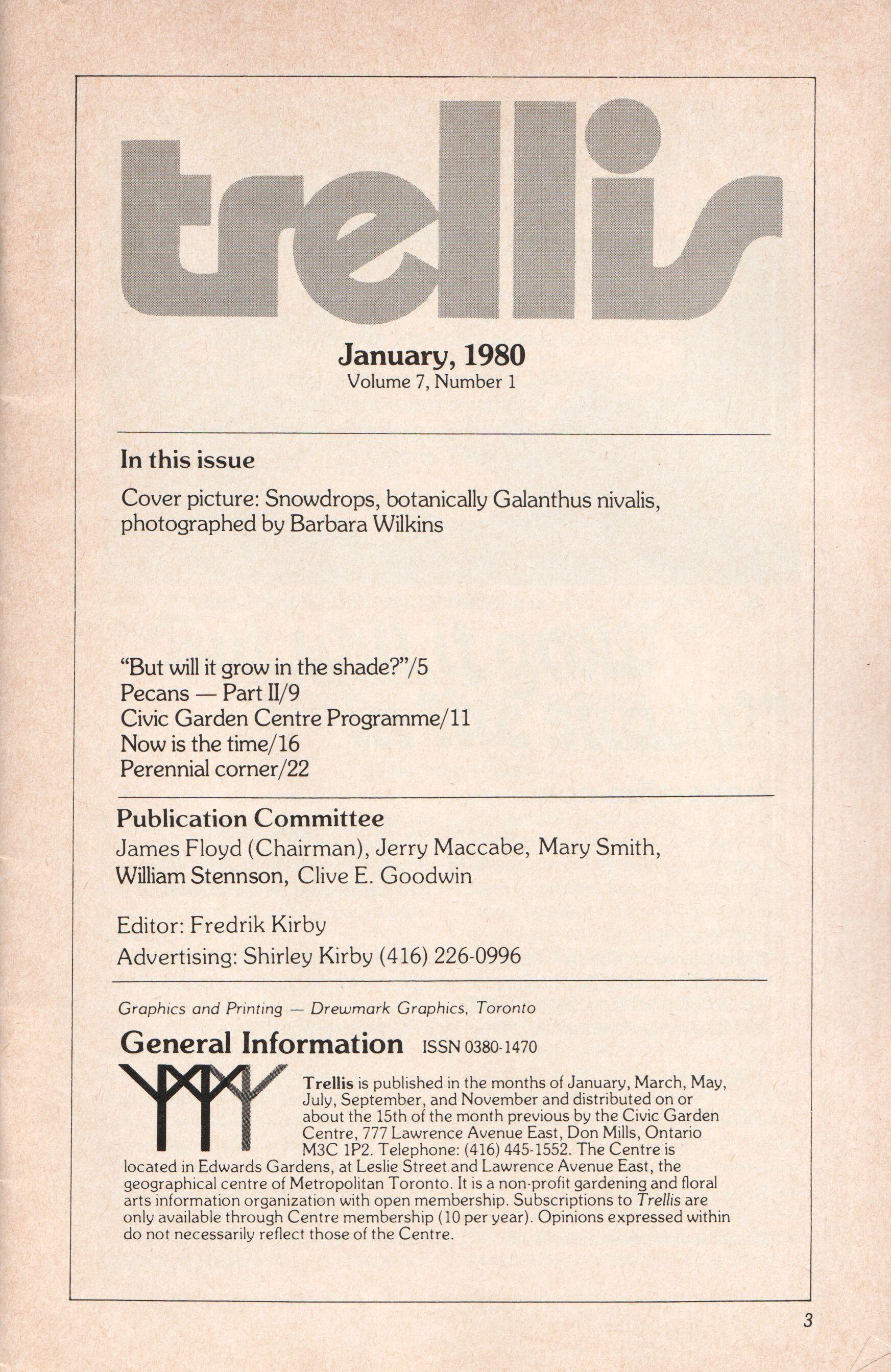 Trellis is published in the months of January, March, May, July, September, and November and distributed on or about the 15th of the month previous by the Civic Garden Centre, 777 Lawrence Avenue East, Don Mills, Ontario M3C 1P2. Telephone: (416) 445-1552. The Centre is located in Edwards Gardens, at Leslie Street and Lawrence Avenue East, the geographical centre of Metropolitan Toronto. It is a non-profit gardening and floral arts information organization with open membership. Subscriptions to Trellis are only available through Centre membership (10 per year). Opinions expressed within do not necessarily reflect those of the Centre.
