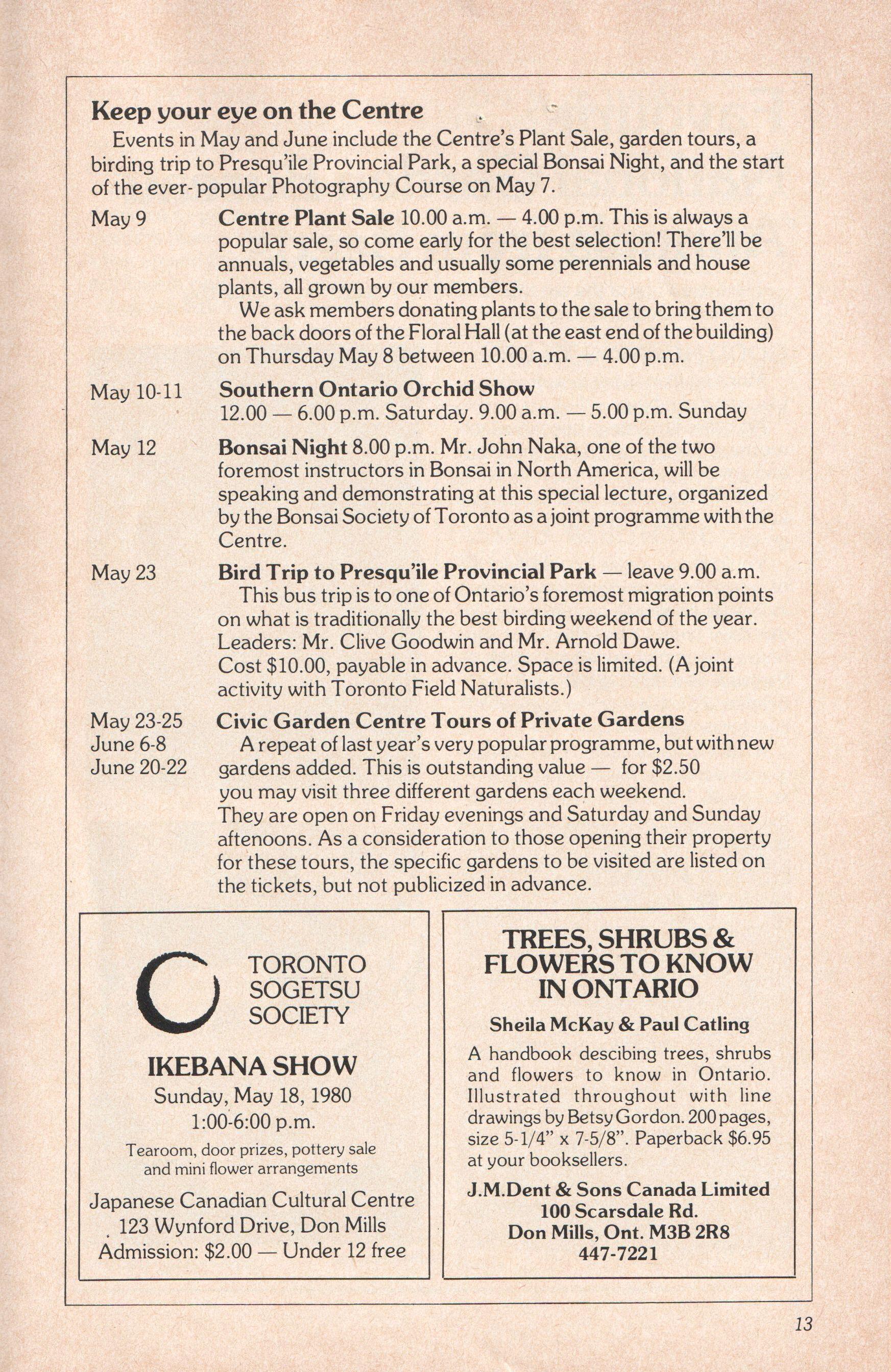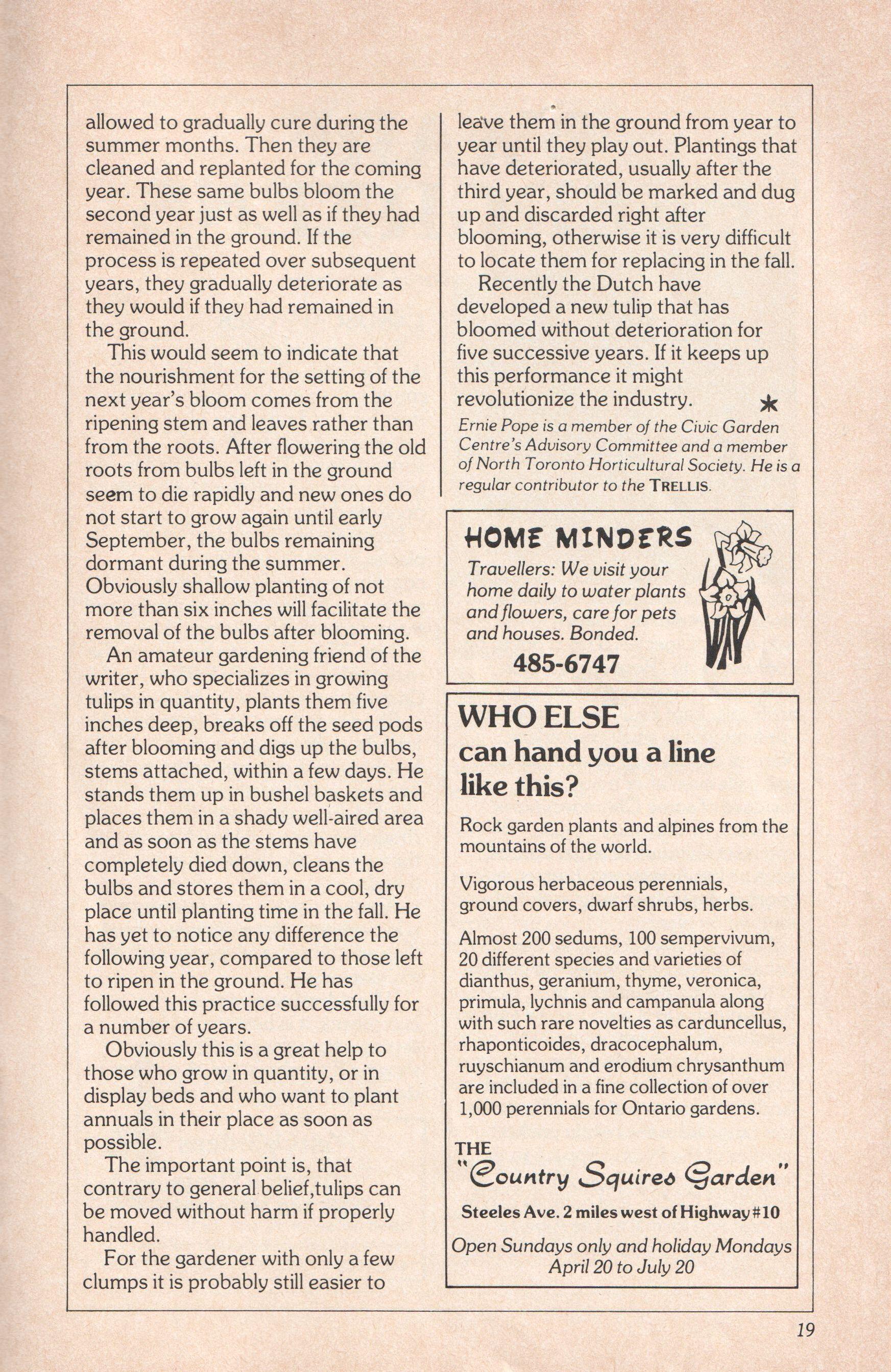 At Edwards Gardens, where the Civic Garden Centreis located, a large and beautiful display of tulips has been grown for some years by the Metro Toronto Parks Department. About ten days after they have bloomed in May, they are carefully dug up with the stems and foliage still attached to the bulbs and laid out bare rooted on the floor of the loft of a barn located on the property, and