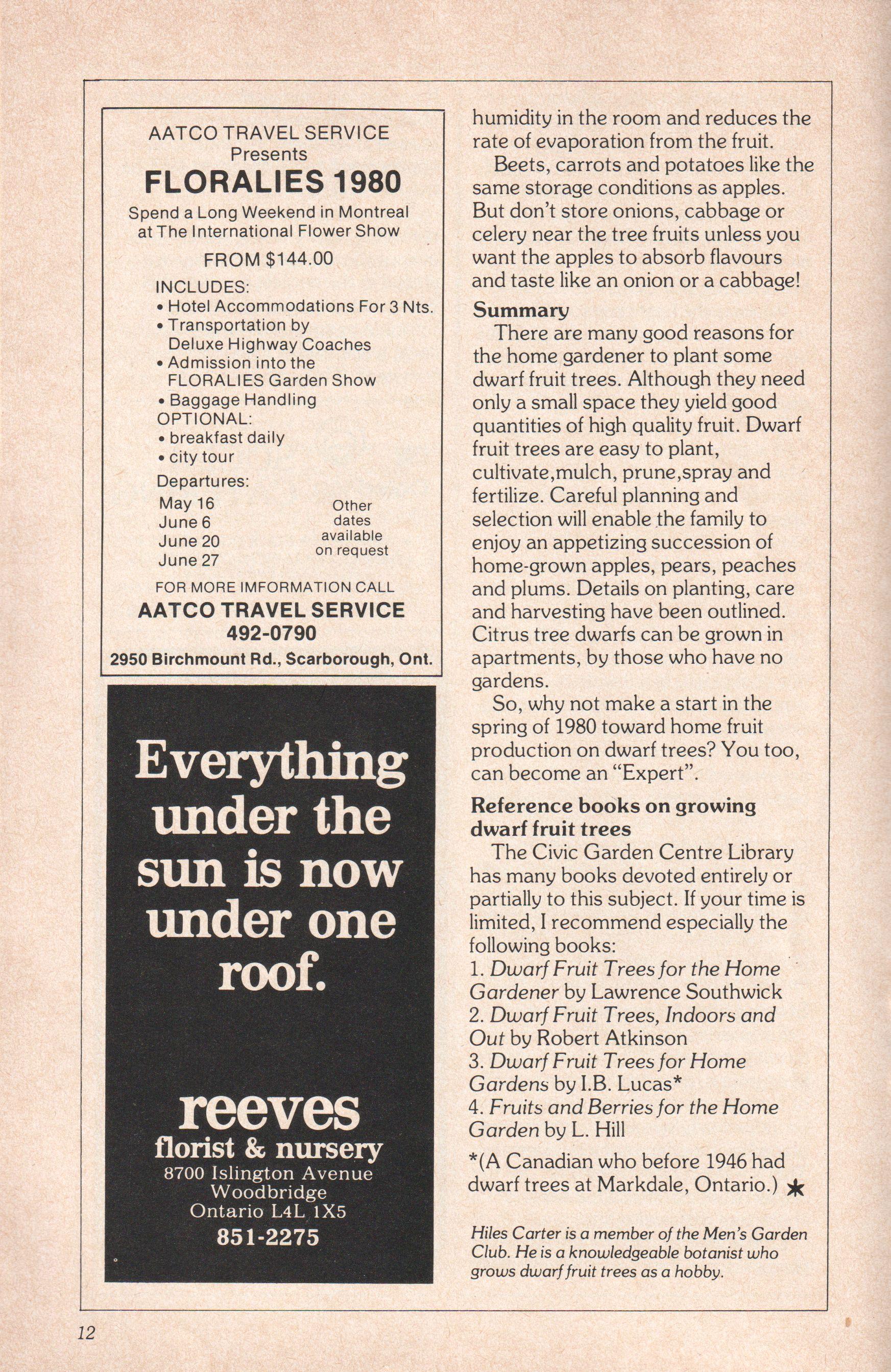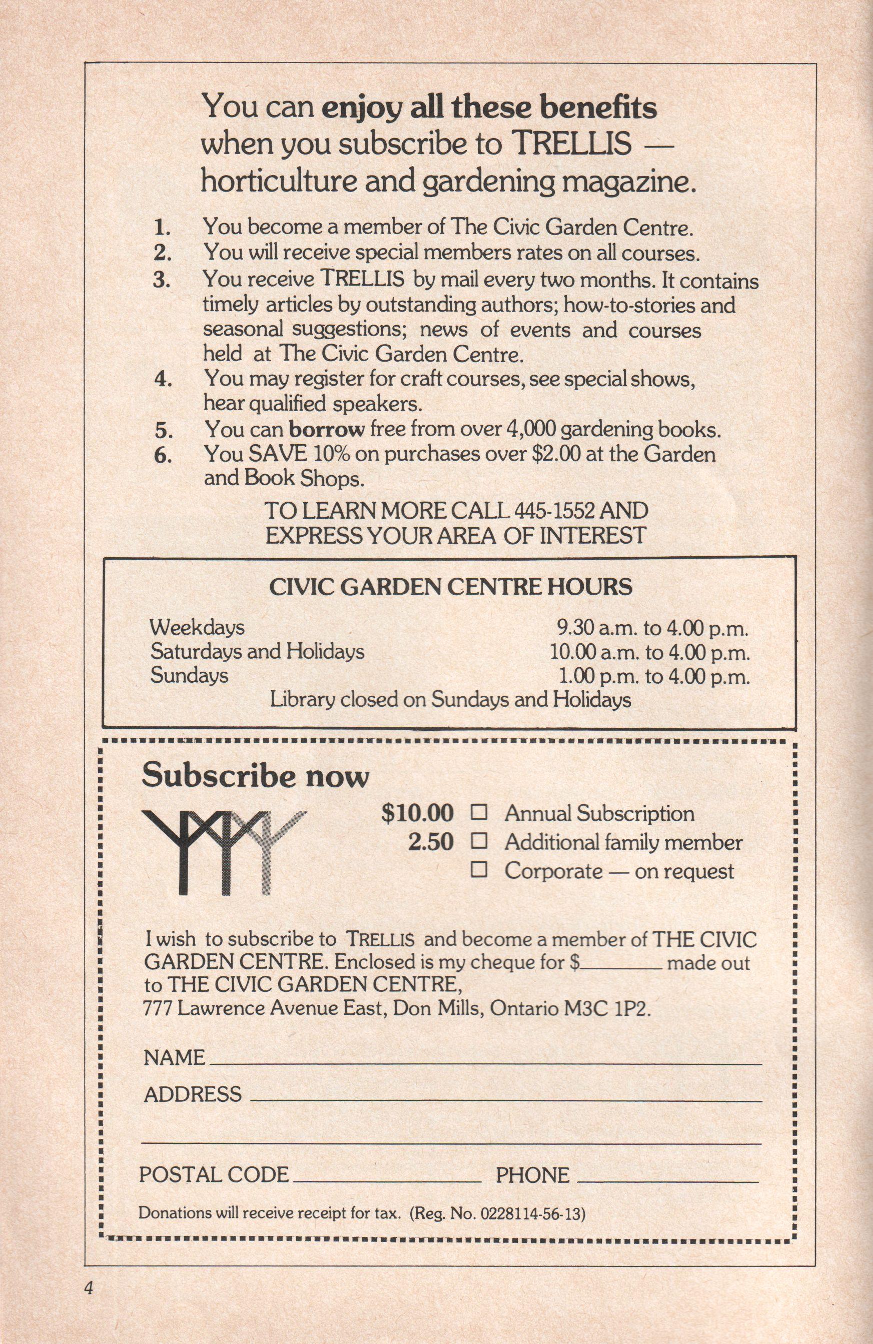 Trellis is published in the months of January, March, May, July, September, and November and distributed on or about the 15th ofthe month previous by the Civic Garden Centre, 777 Lawrence Avenue East, Don Mills, Ontario - MB3C 1P2. Telephone: (416) 445-1552. The Centre is located in Edwards Gardens, at Leslie Street and Lawrence Avenue East, the geographical centre of Metropolitan Toronto. It is a non-profit gardening and floral arts information organization with open membership. Subscriptions to Trellis are only available through Centre membership (10 peryear). Opinions expressed within do not necessarily reflect those of the Centre.