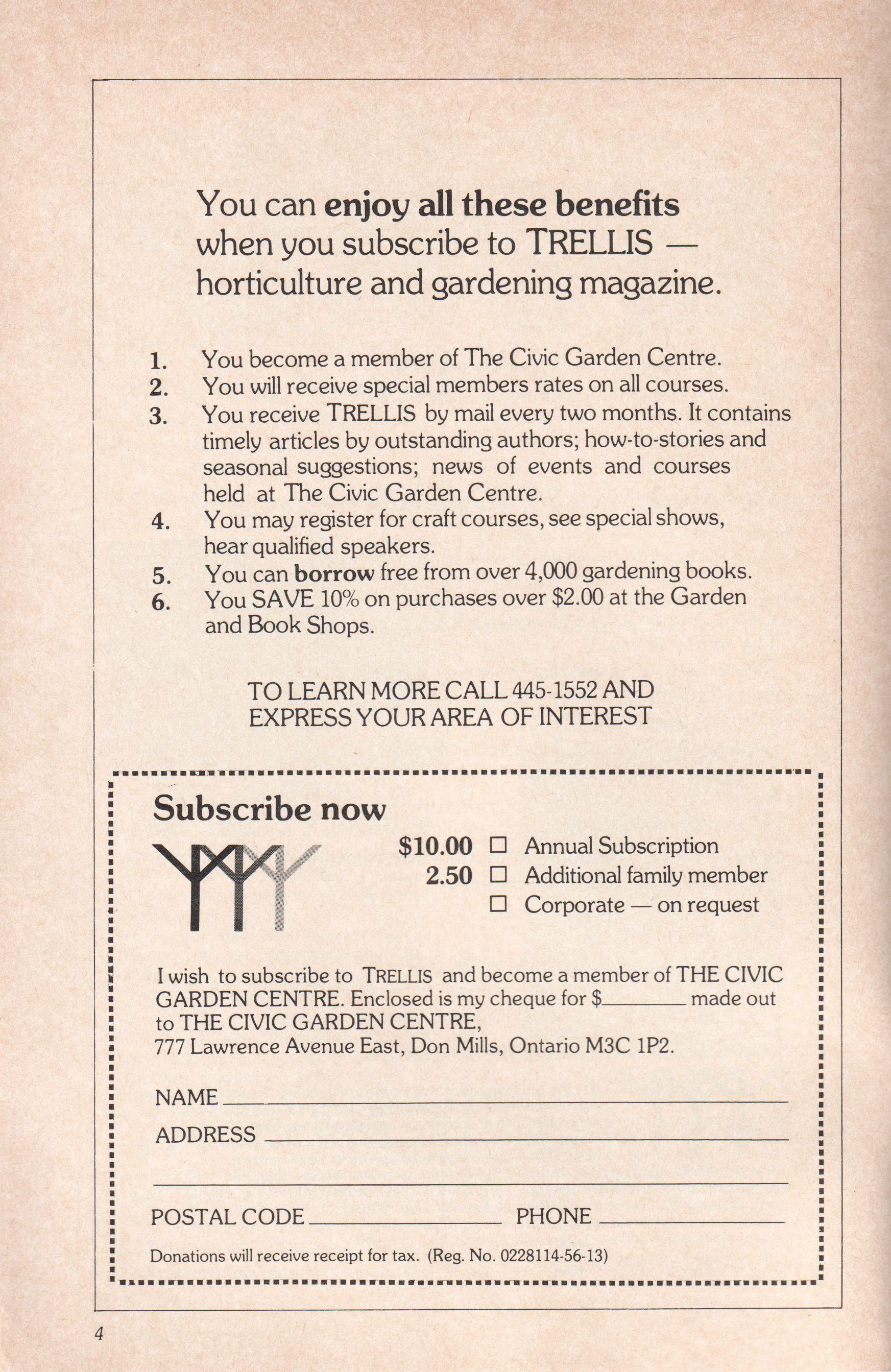 You become a member of The Civic Garden Centre. You will receive special members rates on all courses. You receive TRELLIS by mail every two months. It contains timely articles by outstanding authors; how-to-stories and seasonal suggestions; news of events and courses held at The Civic Garden Centre.