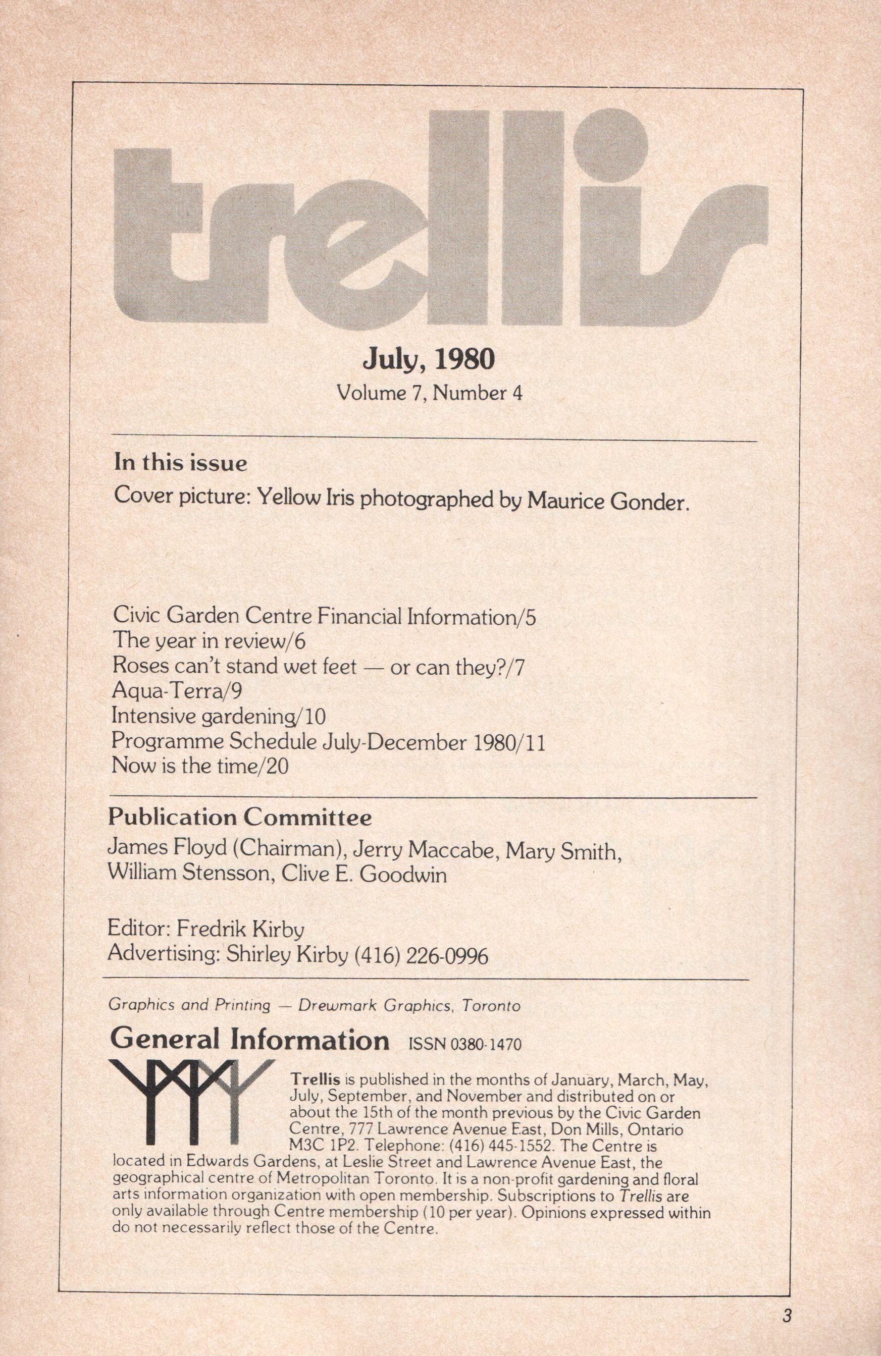 Trellis is published in the months of January, March, May, July, September, and November and distributed on or about the 15th of the month previous by the Civic Garden Centre, 777 Lawrence Avenue East, Don Mills, Ontario M3C 1P2. Telephone: (416) 445-1552. The Centre is located in Edwards Gardens, at Leslie Street and Lawrence Avenue East, the geographical centre of Metropolitan Toronto. It is a non-profit gardening and floral arts information organization with open membership. Subscriptions to Trellis are only available through Centre membership (10 per year). Opinions expressed within do not necessarily reflect those of the Centre.