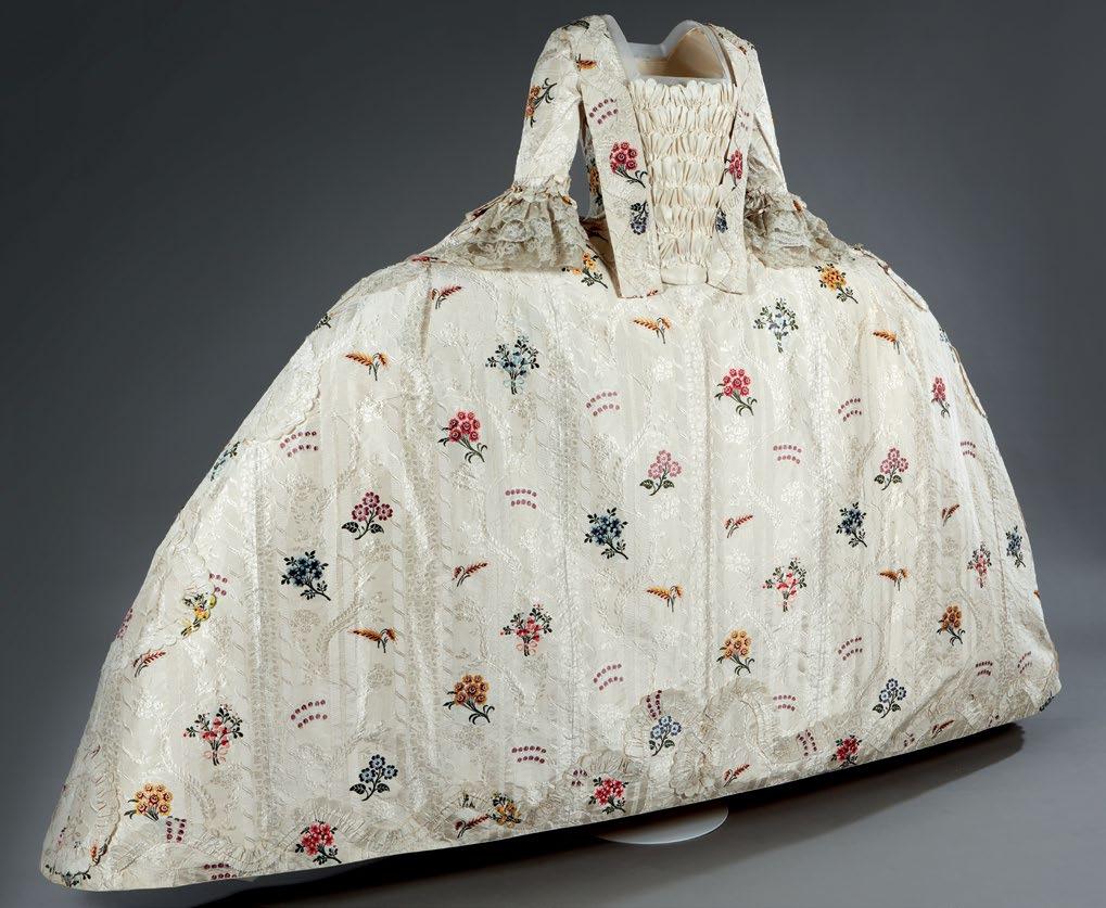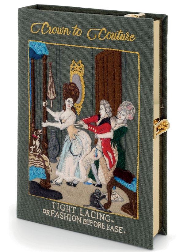 mid-18th century. The dress is a stunning example of the English silks that mantuas of women attending court during this period needed to be made from. Entire industries, and the London economy, relied on the court season. The silk on this stunning mantua has been brocaded with woven flower motifs which have been beautifully interpreted by the designers and seamstresses at the brand Olympia Le-Tan onto a book clutch. George III’s Coronation Fan was produced in commemoration of the Coronation of King George III in 1761. Aptly on display during this Coronation year, it features within the exhibition to highlight accessories worn to court. The King and Queen both feature on the fan wearing their Coronation robes. The satire print, ‘Tight Lacing or Fashion before Ease’ is just one print within the Historic Royal Palaces’ print collection, which covers fashion, interiors and architecture, as well as iconic palace scenes.
