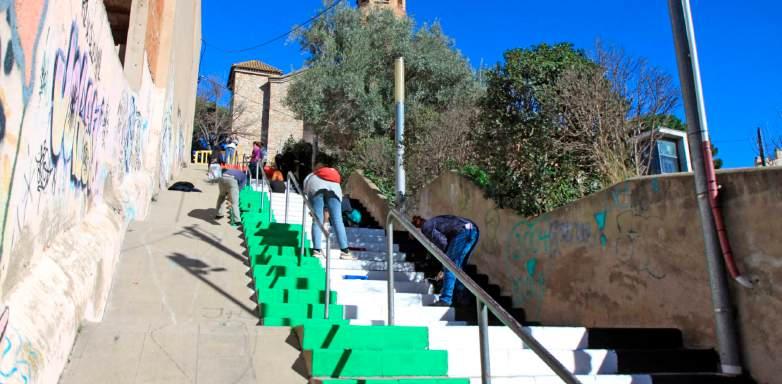 La Xarxa Palestina Ripollet ha pintat dels colors del país les escales que ajunten el carrer Maragall amb el carrer Padró, al parc María Lluïsa Galobart. La bandera que ara adorna els graons ha estat dibuixada entre alumnes i professors de l’INS Can Mas, membres de la Xarxa Palestina Ripollet i veïns que s’han apropat a donar un cop de mà, la matinal reivindicativa va congregar prop d’un centenar de participants. Des de l’entitat ripolletenca s’ha optat per mudar les escales “perquè estan al costat de l’església, un monument característic de Ripollet”, explica Alba Vázquez. Tot i això, durant la pintada es van apropat passejants crítics amb l’activitat. L’acte va coincidir amb una manifestació a Barcelona organitzada per la Comunitat Palestina de Catalunya i la Coalició Prou Complicitat amb Israel.Tot i així l’entitat va mantenir la pintada ja que no tothom podia desplaçar-se. . Laia Jubany