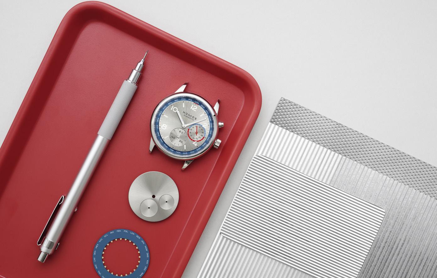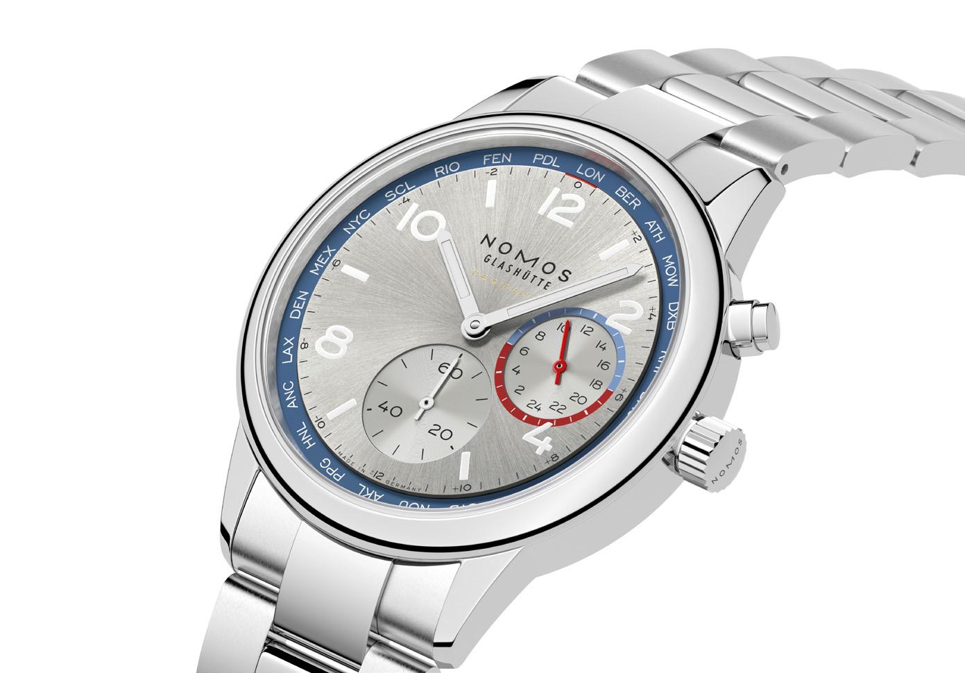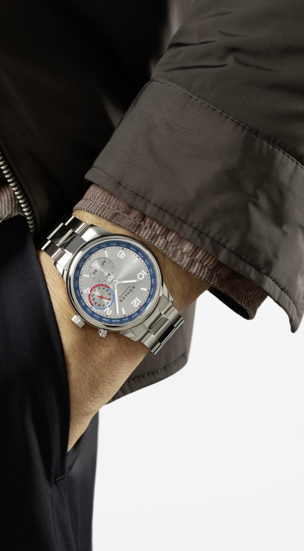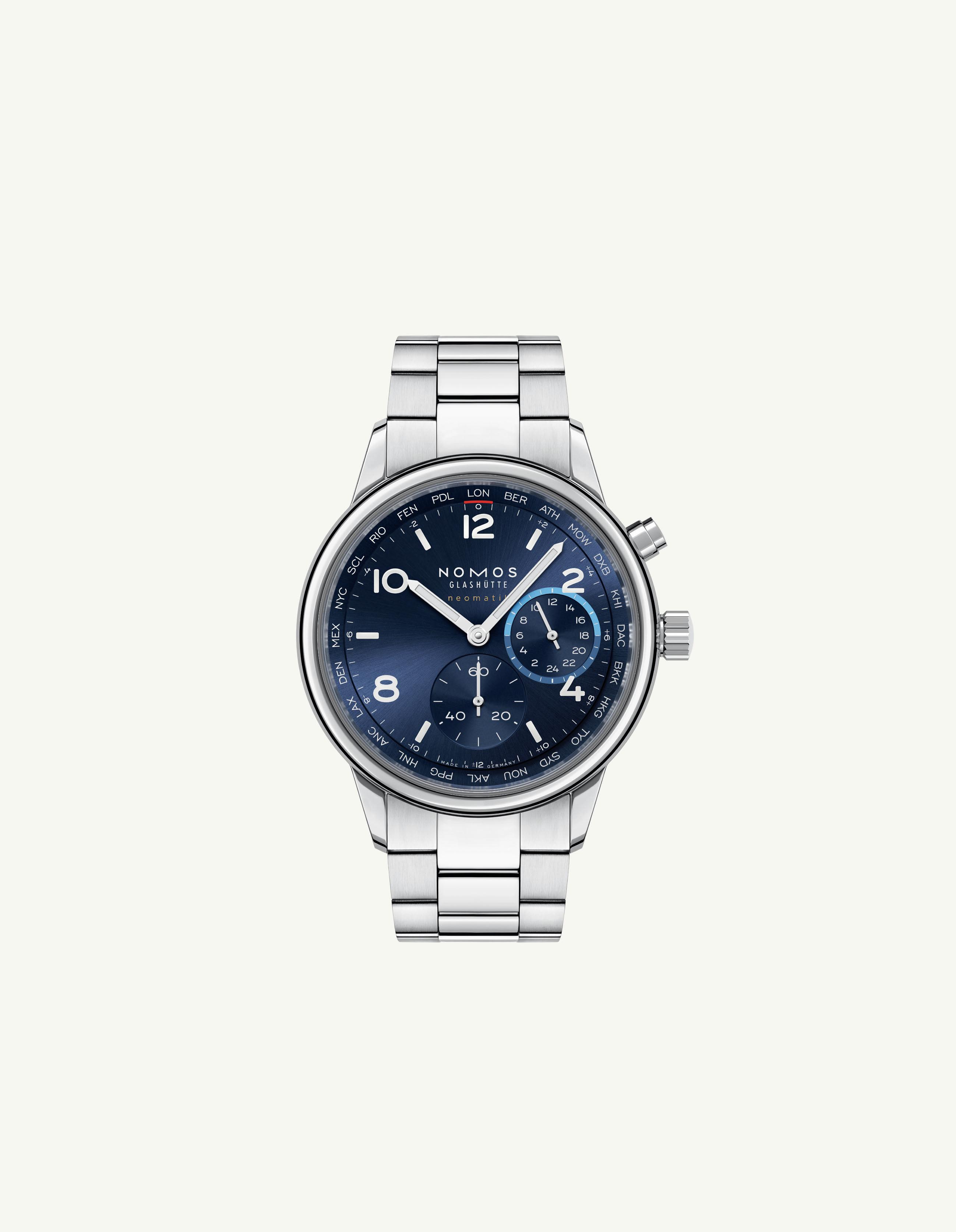 Your Worldtimer: Club Sport neomatik Worldtimer blue. With the new automatic caliber DUW 3202, NOMOS Glashütte brings sportiness and elegance to worldtimers. Its innovative construction means that this watch is under 10 mm in height. The dial with a sunburst finish features a 24-hour home time zone display with a day/night indicator. The 24 time zones are denoted with city codes, with the respective time differences visible at a glance. At the push of a button, you can effortlessly travel through time—making Club a useful companion for global citizens and frequent travelers. 40 mm in diameter and water resistant to 10 atm. Also available with a rhodium-plated dial at The Timepiece Collection, as well as online: thetimepiececollection.com and nomos-glashuette.com
