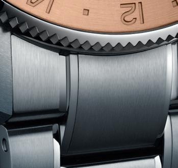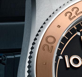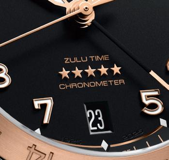 24 different time zones are represented by codes on the city disk, which is placed around the dial as an outer ring; a red line above 12 o'clock marks the region selected as the local time zone. The 24-hour display at 3 o'clock shows the second time zone which could be your home time for when you are traveling, or another place that you want to keep in close contact with.