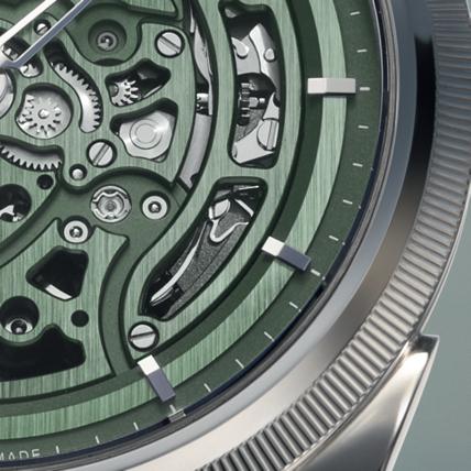 In the rose gold version, the dial adopts another equally evocative tone: a Golden Hour grained dial with sandy reflections, inspired by the soft, warm light of late afternoon. This natural, almost mineral tone evokes a solar, serene elegance, offering a warmer interpretation of the same inner balance.